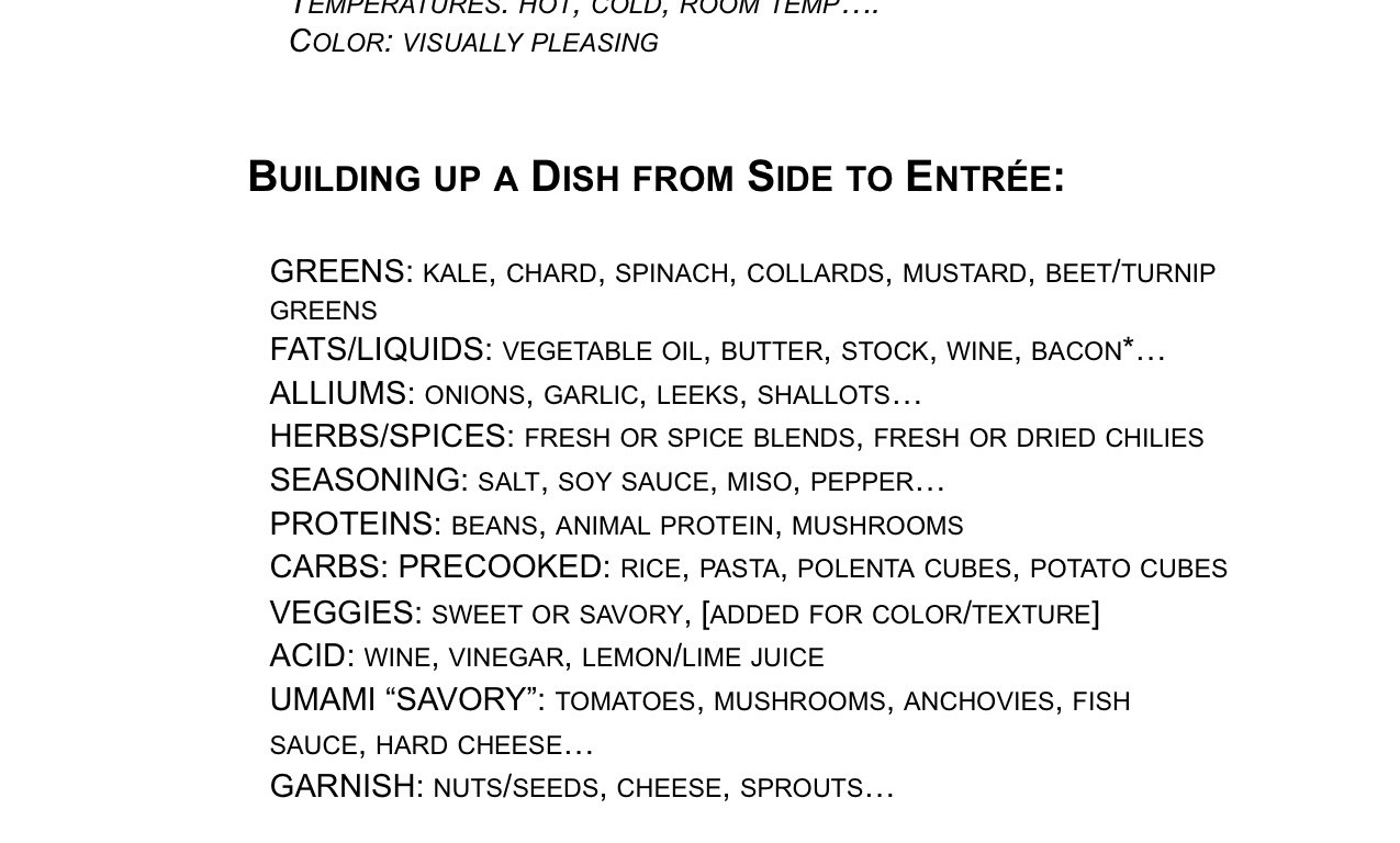 Each ingredient category will build flavor, texture, color, taste, and temperature variables. You can make a side dish of greens only using salt, or layering on an acid, an herb, and so-on.