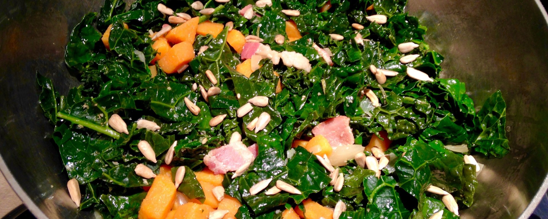 RECIPE: Serves 2-3 *Note: I am writing this as a dish with uncooked greens and sweet potatoes. If you have cooked greens and yams, merely fry up the bacon and garlic and toss in the greens and yams then simmer with a little water, covered, until warm.