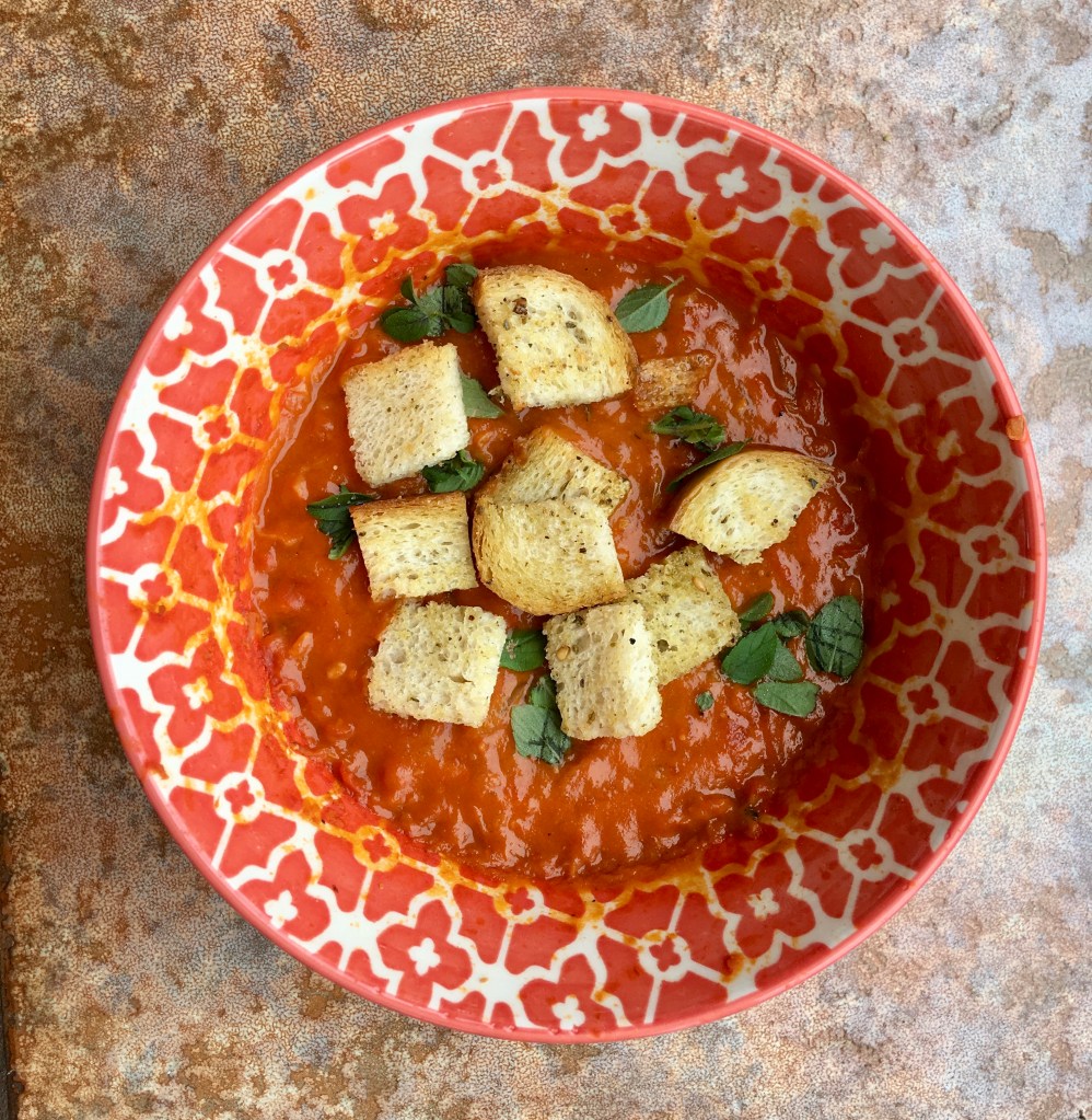 - Serve garnished with chopped, fresh basil and croutons on occasion