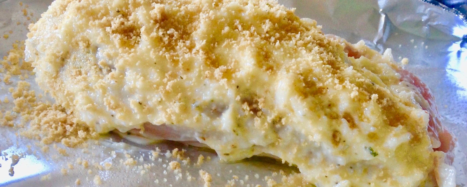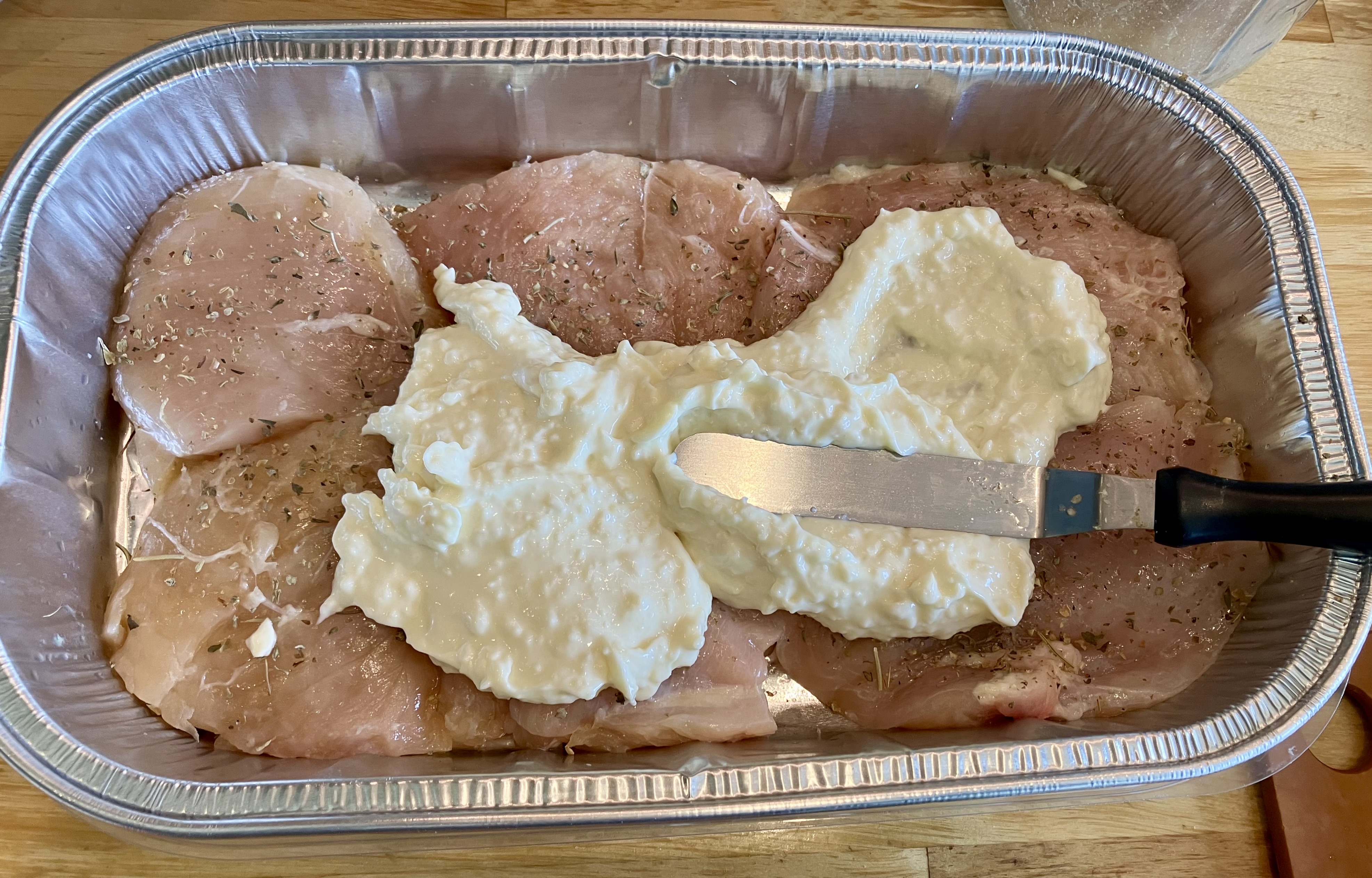- Lay chicken on lightly oiled foil. Spread mayo mixture on just the top of the breasts