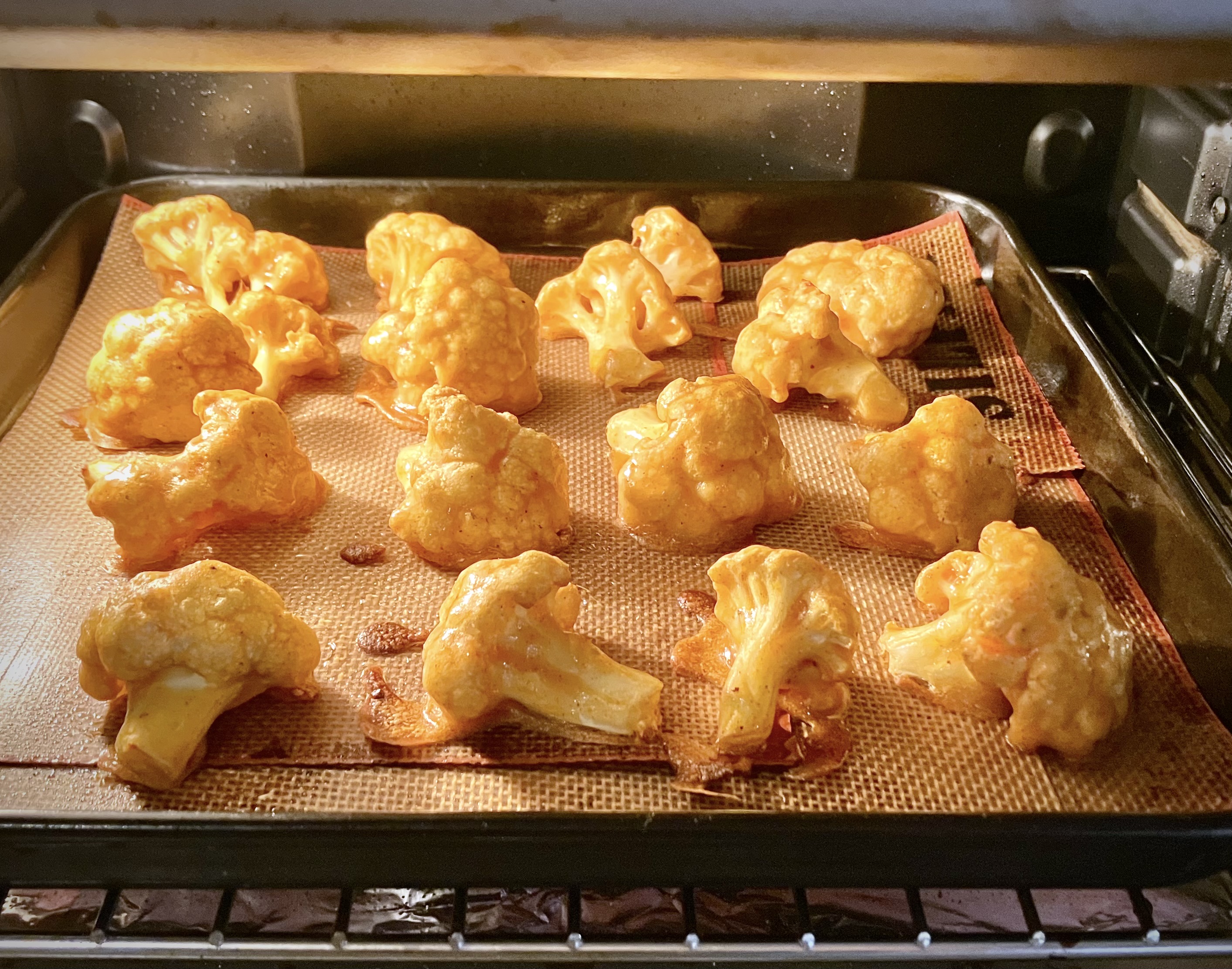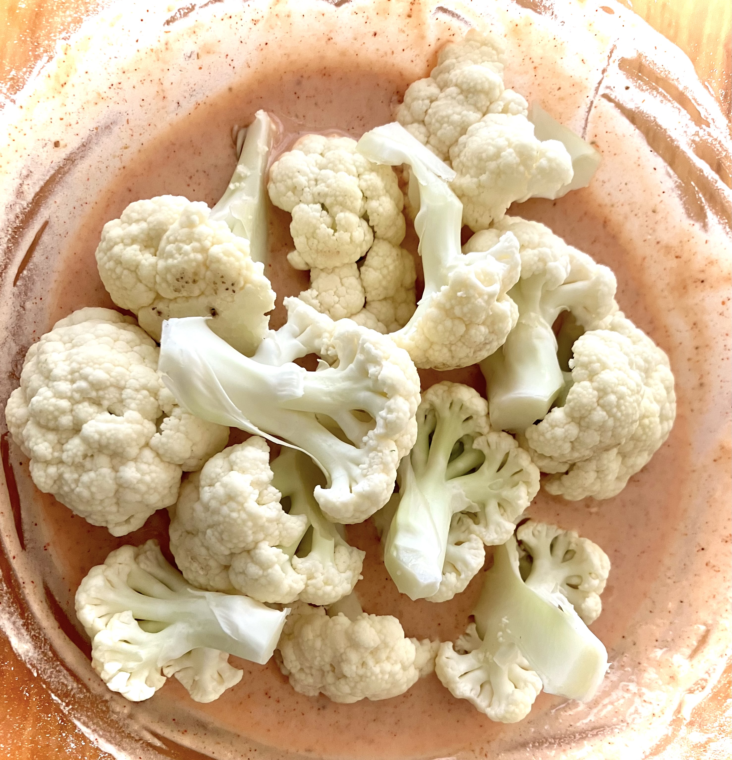 - Add the cauliflower and toss well. Using tongs transfer cauliflower to a baking sheet in a single layer. Do not add any remaining batter once the cauliflower are on the sheet.
