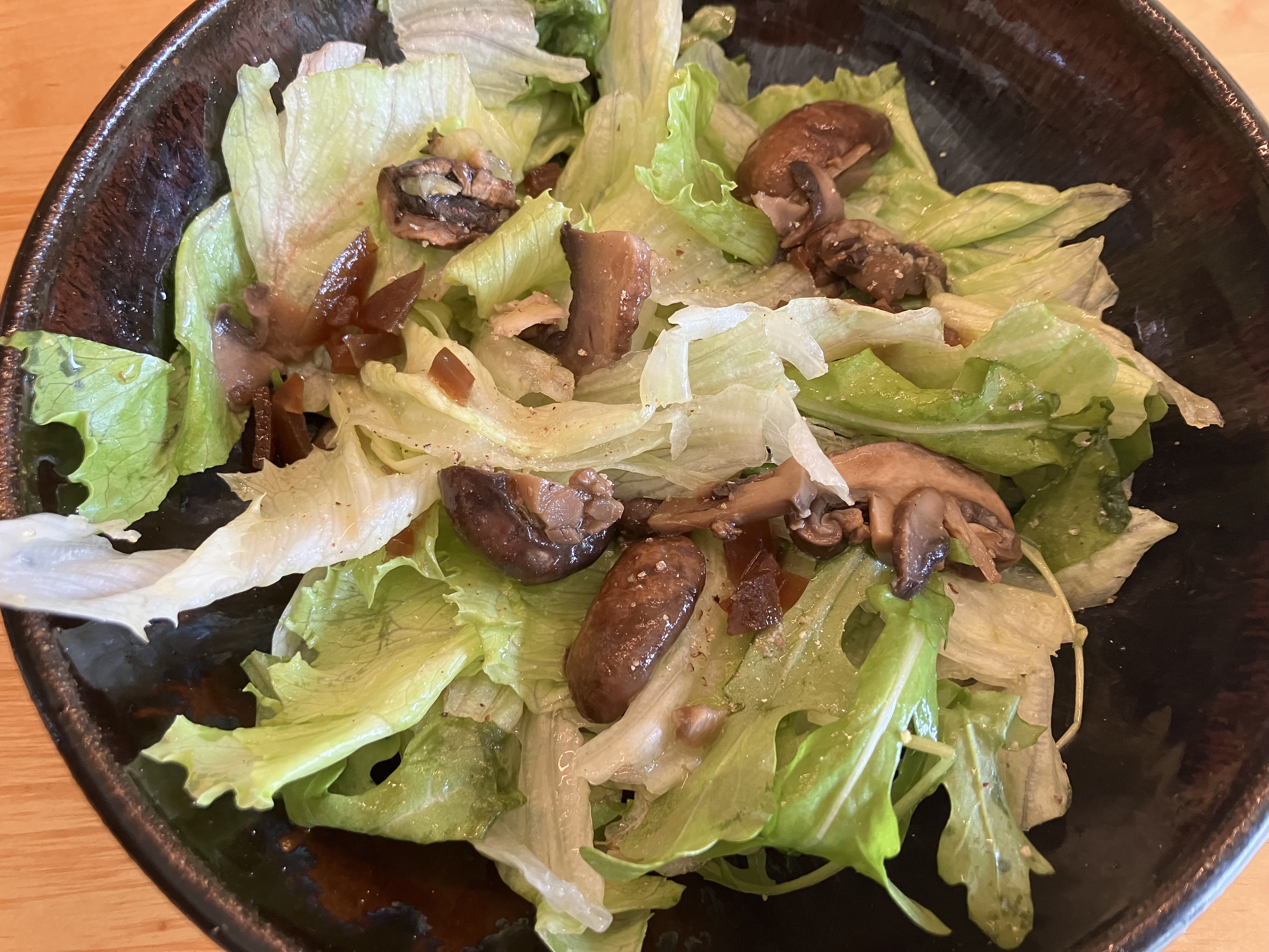 L: Pizza Topped with Mushrooms [right slice] R: Simple Tossed Salad with Marinated Mushrooms as Both Topping and Dressing