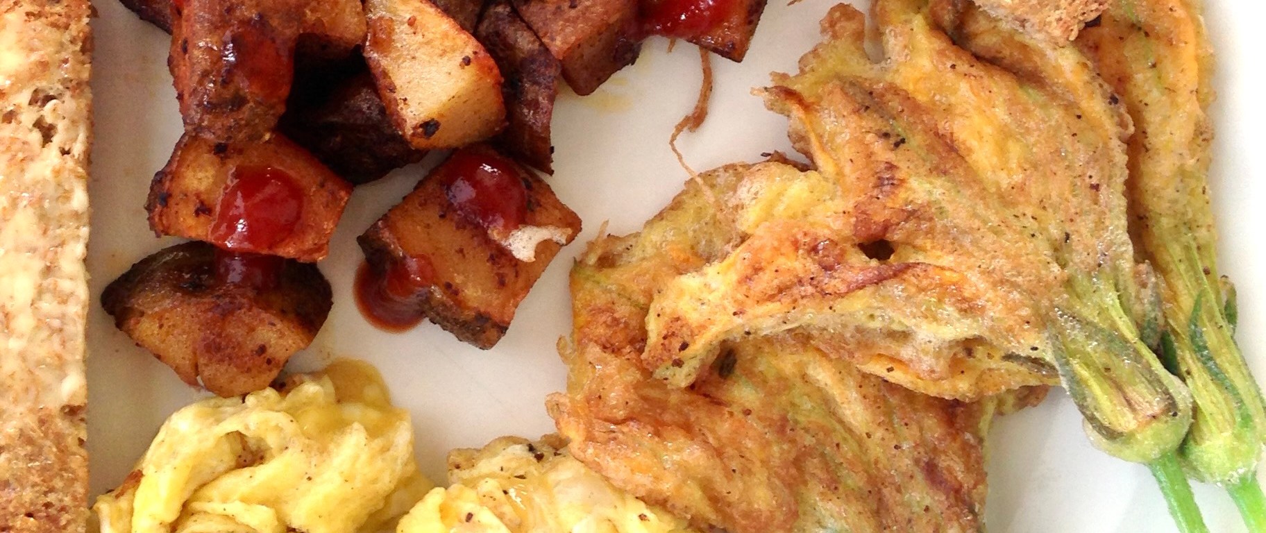 Collect the blossoms in the morning by cutting and storing in the fridge in a plastic bag—no washing, just a sheet of paper toweling, and keep the bag partially closed. Continue to collect the blossoms for up to a week or until you get about 3 blossoms per diner. Then follow this recipe