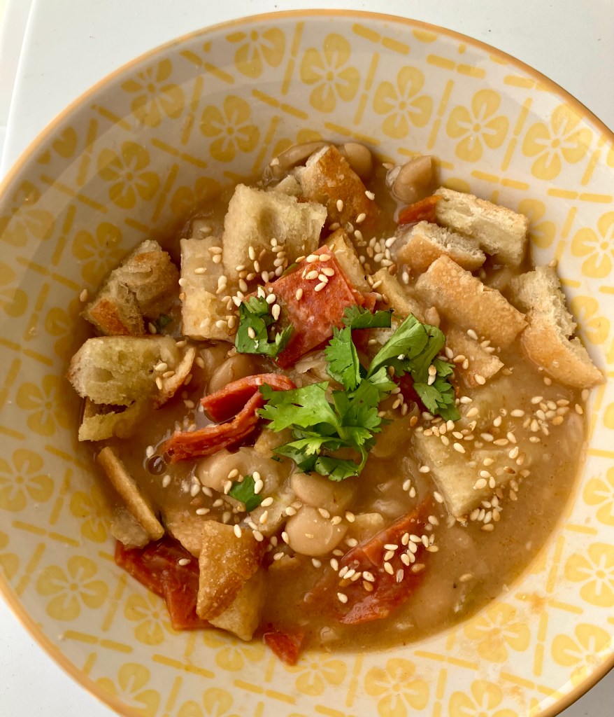 Kimchi & Lima Bean Soup [Below]: Wowzer! Before serving, stir in chopped kimchi for an umami punch. I had some leftover seared Ahi tuna, some avocado, noodles, and sesame seeds and it became a restaurant grade, main course soup.