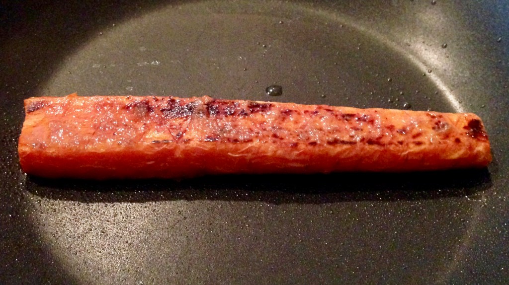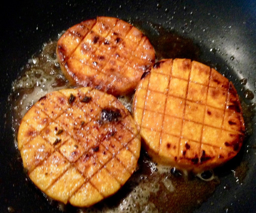 Dry frying produces a more dense texture: filets of mushrooms, eggplant, summer squash, even carrots will act more like an entree meaty dish. This happens when you create grooves on the surface of the veggie, and then fry with no or very little oil. This allows the moisture to quick-release and wicks away out of the grooves, yielding a firmer texture when they finish cooking. Salt is not added until cooking is complete. Dry frying will also sear the little squares between the cuts to add color and flavor.