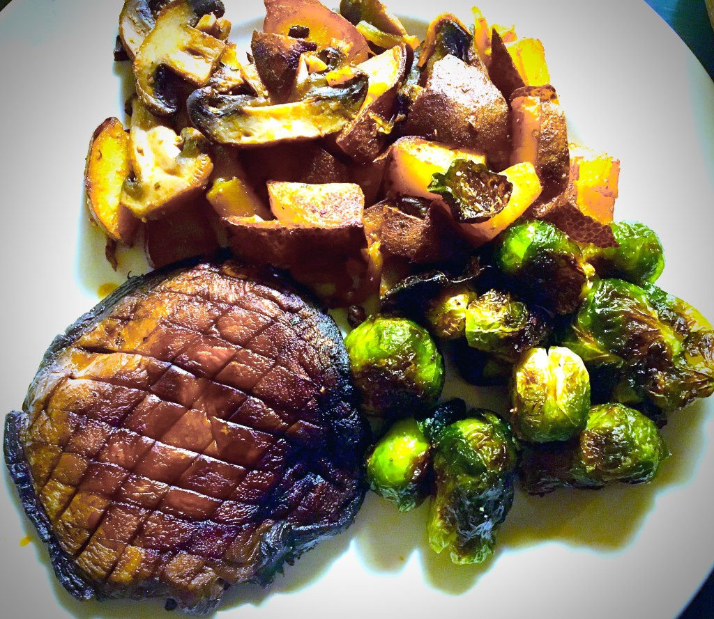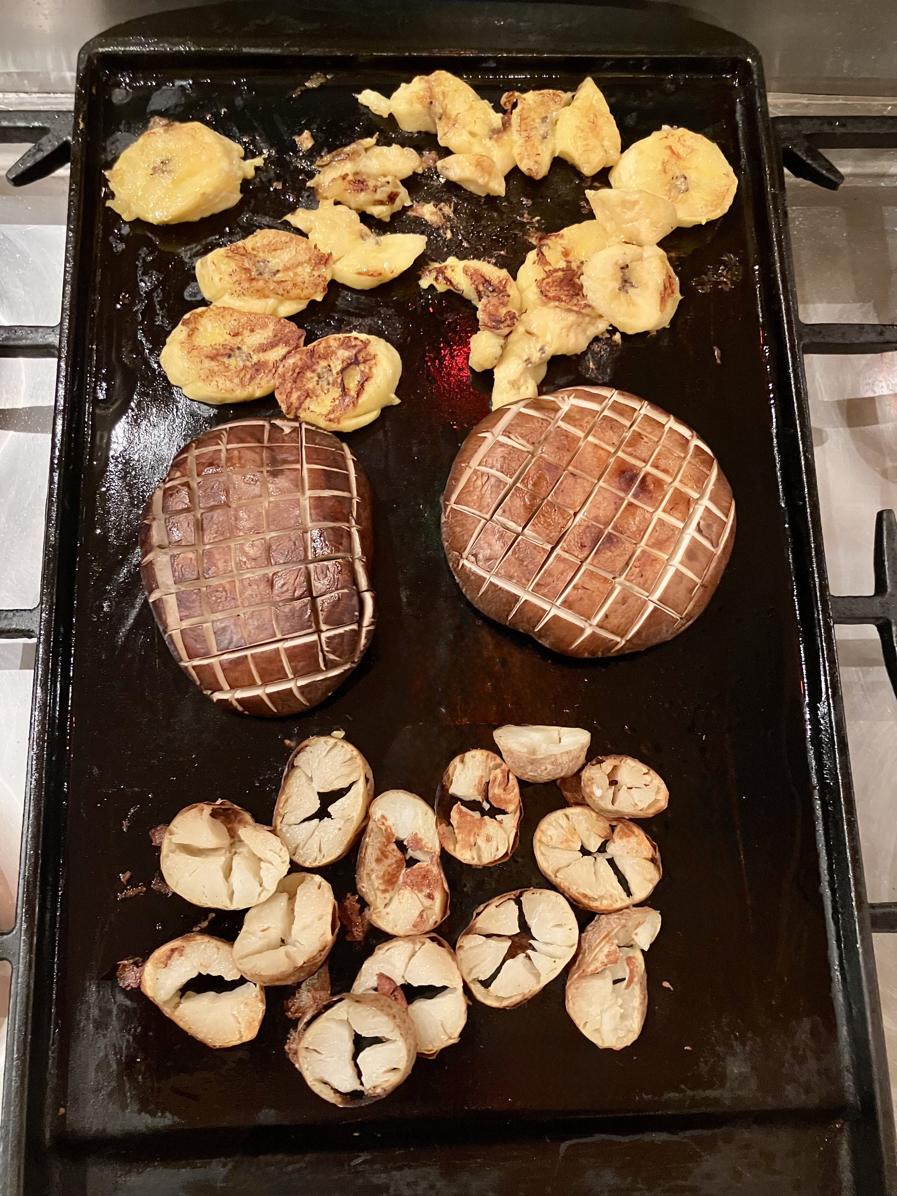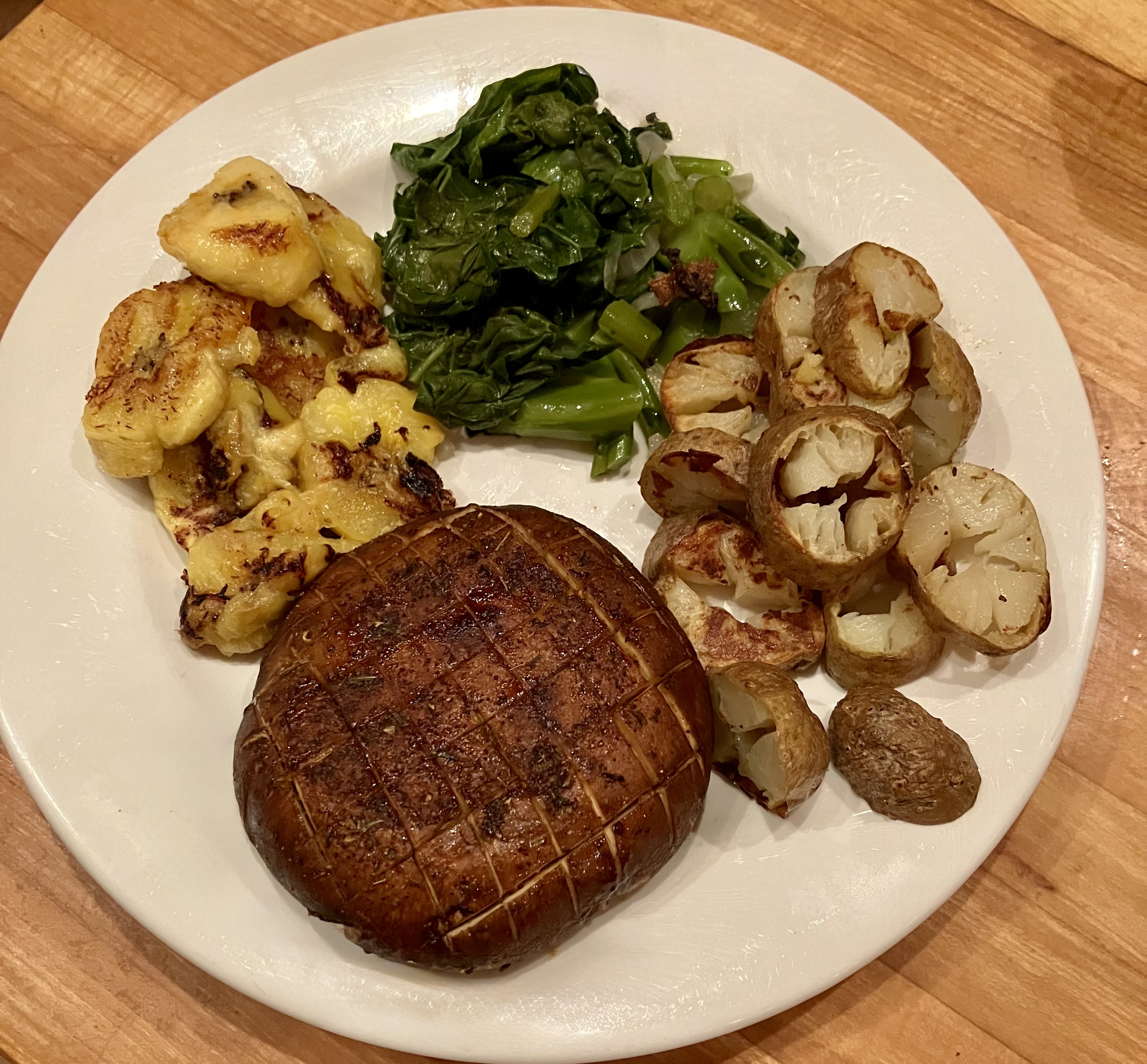 Blackened Portobello with Twice Cooked Potatoes, Plantains, and Steamed Gai Lan
