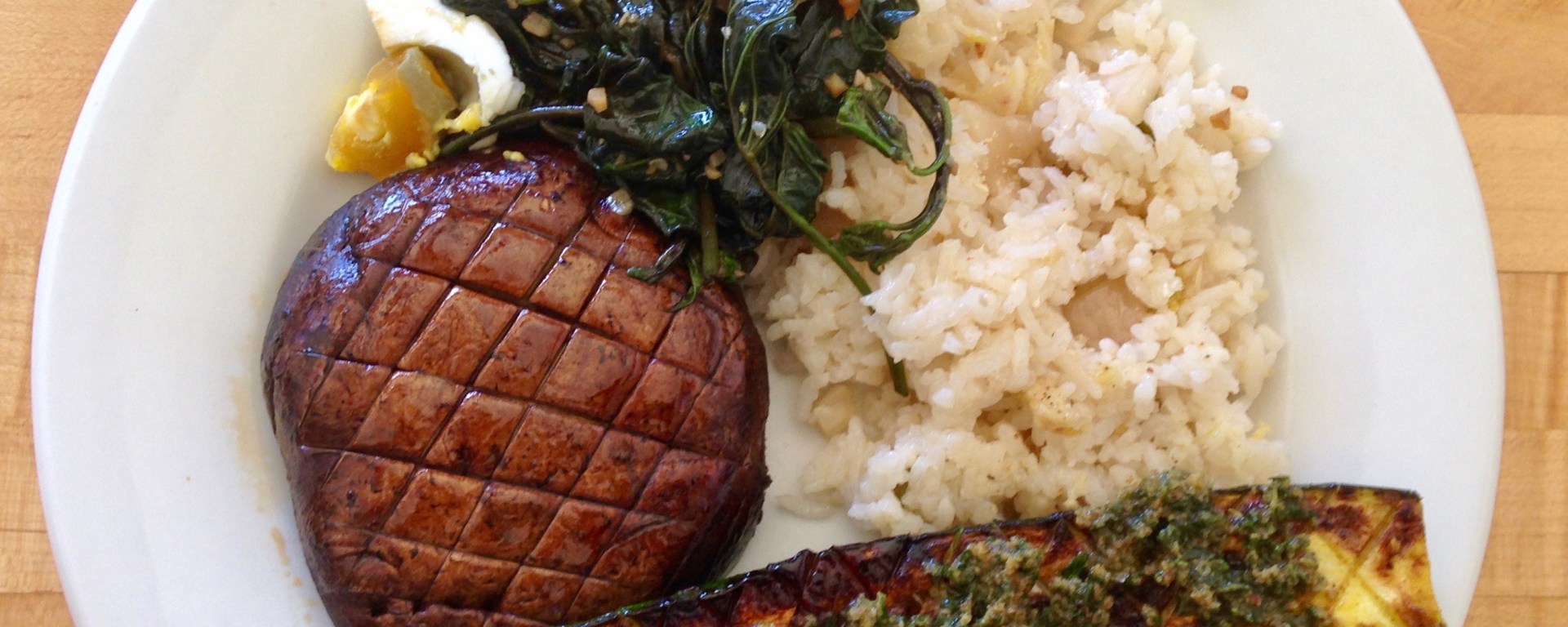 Blackened Portobello with Twice Cooked Potatoes, Plantains, and Steamed Gai Lan