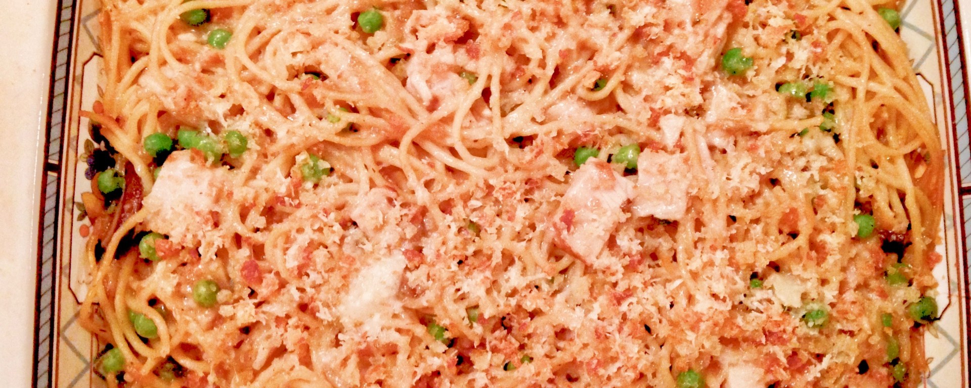 In my childhood tetrazzini was a standard dish often after high holiday season turkey roasts. It’s got all the happies—creamy, chewy, crunchy, cheesy, herby, with a snort of sherry to take it over the top!