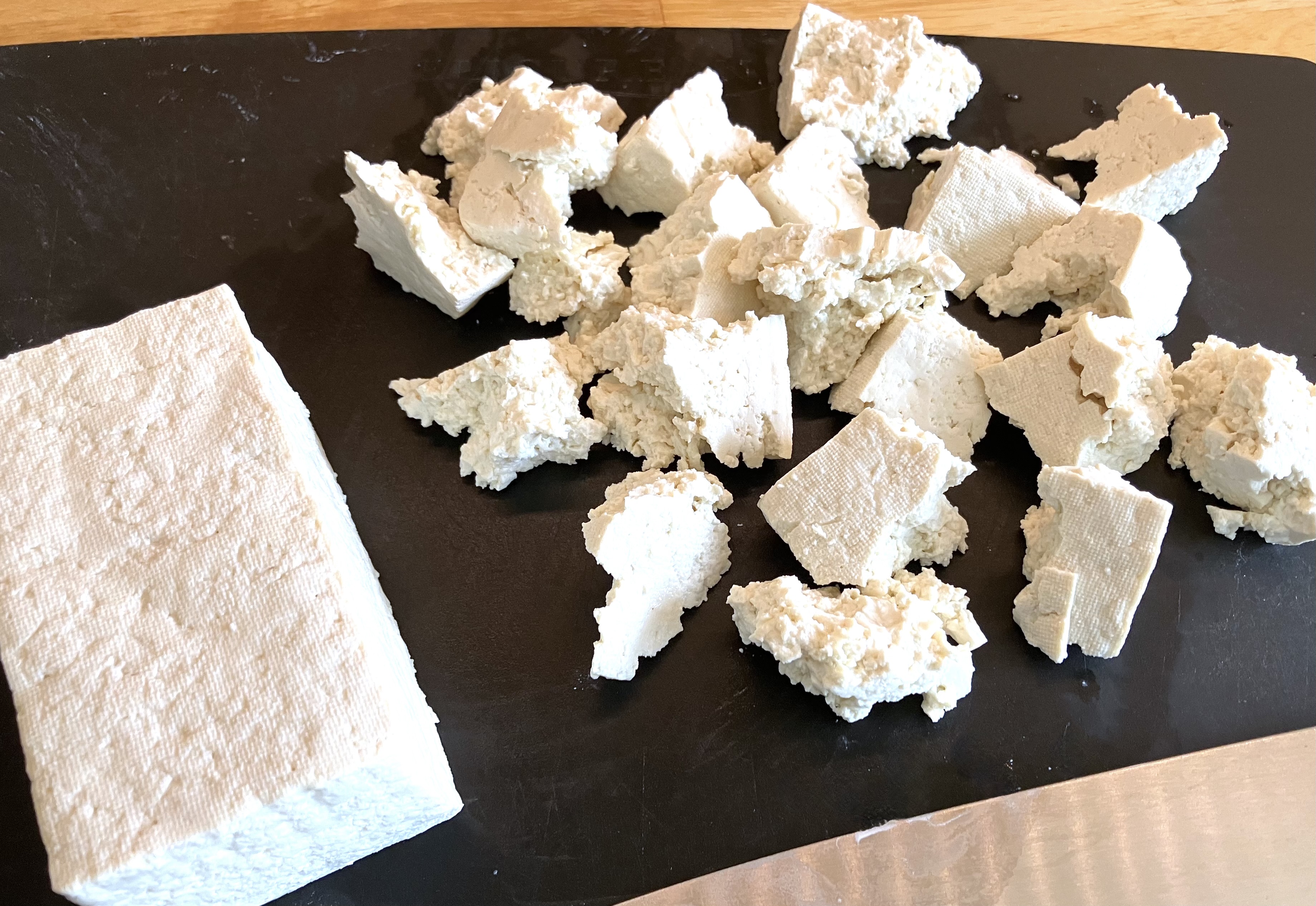 - Lay whole block of tofu on a thick towel and top with another towel. Top with a small cutting board and add a heavy, wide skillet. Be careful as the tofu can shift. Press for about 15-30 minutes. Then tear into roughly 1 inch chunks.