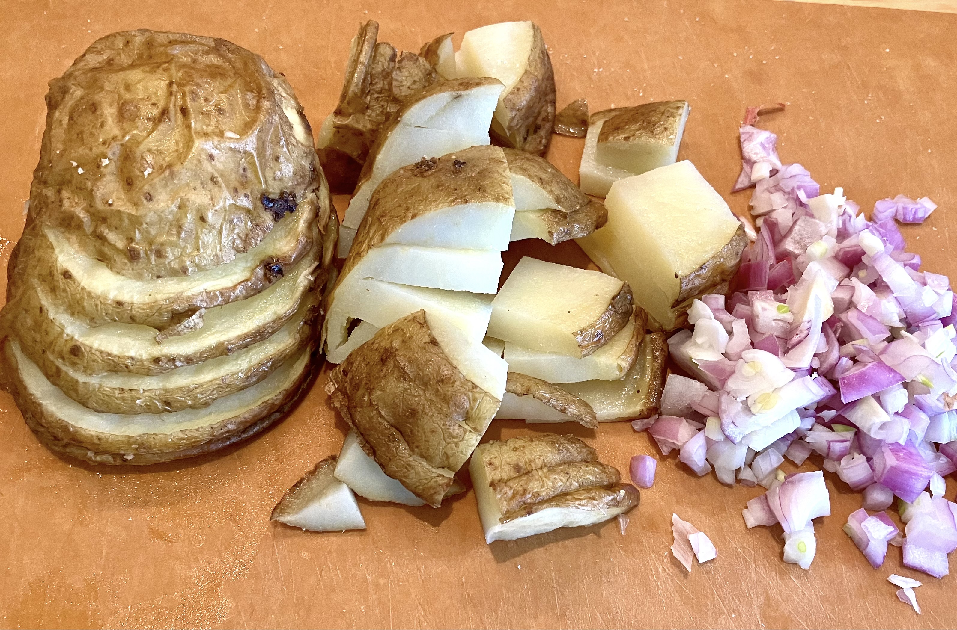 - Slice the cooked hasselbacks, along with some minced alliums [shallot, onion, scallion]