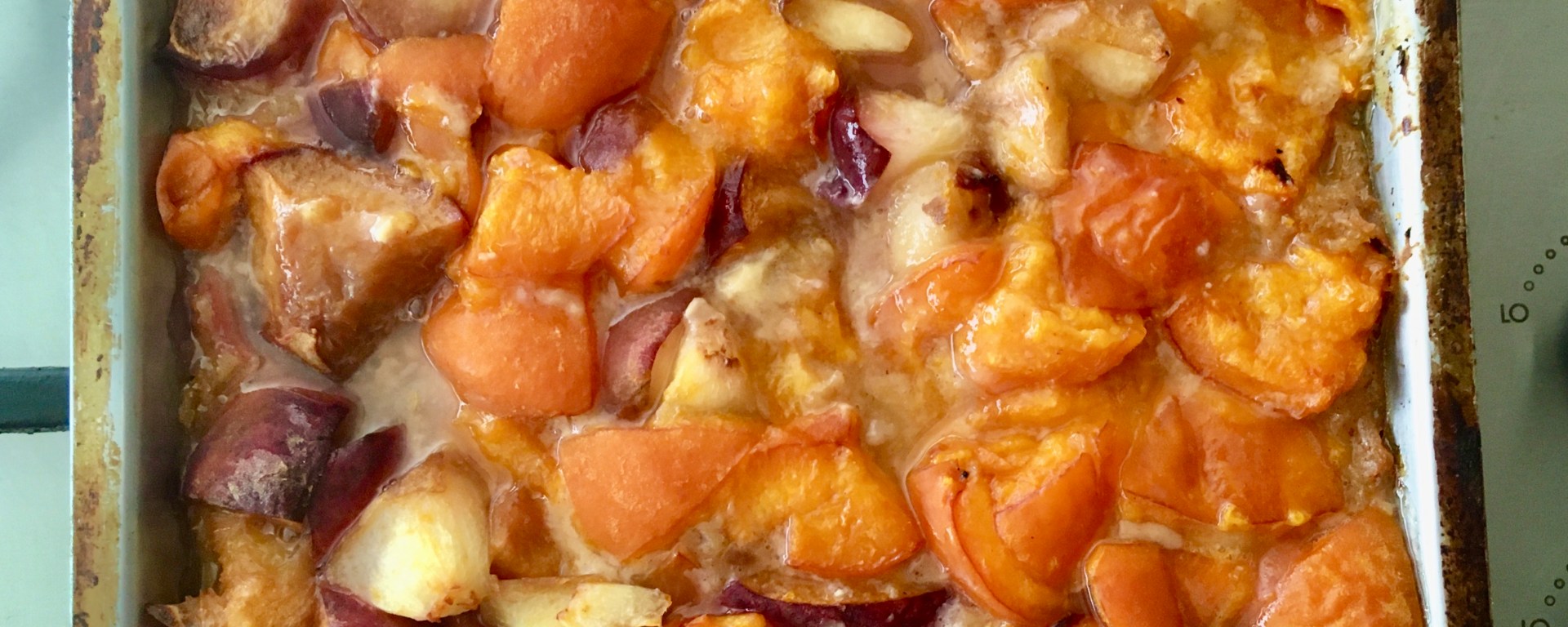 For over 25 years, when I see fresh peaches, plums, or nectarines, I start assembling this cobbler.