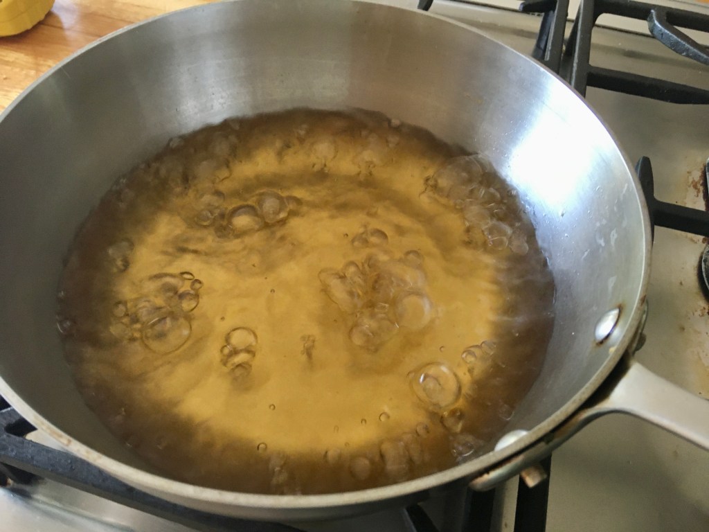 - In a medium pot, heat the butter on medium-low, stirring occasionally until the solids begin to brown; a few minutes; careful – butter can burn near the end. Let cool in the pan
