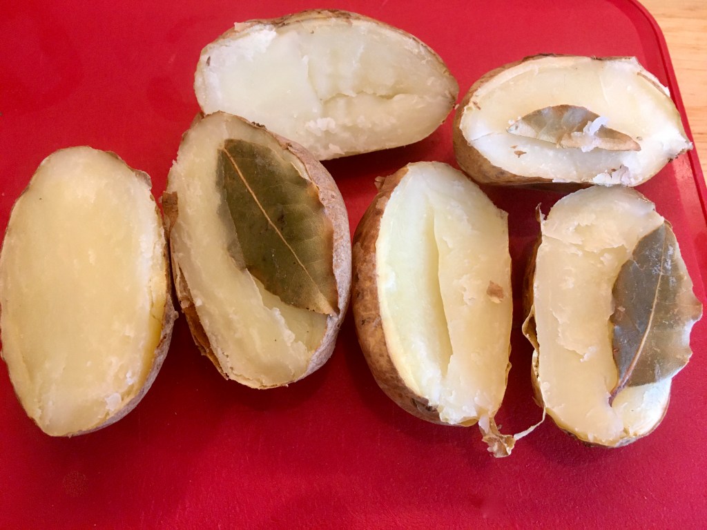 - Cut the potatoes through the slit in half and discard the bay leaves