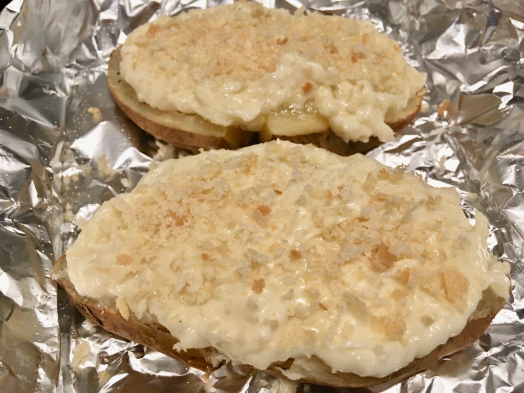 - After the potatoes are baked and cubed, spread the dressing over each
