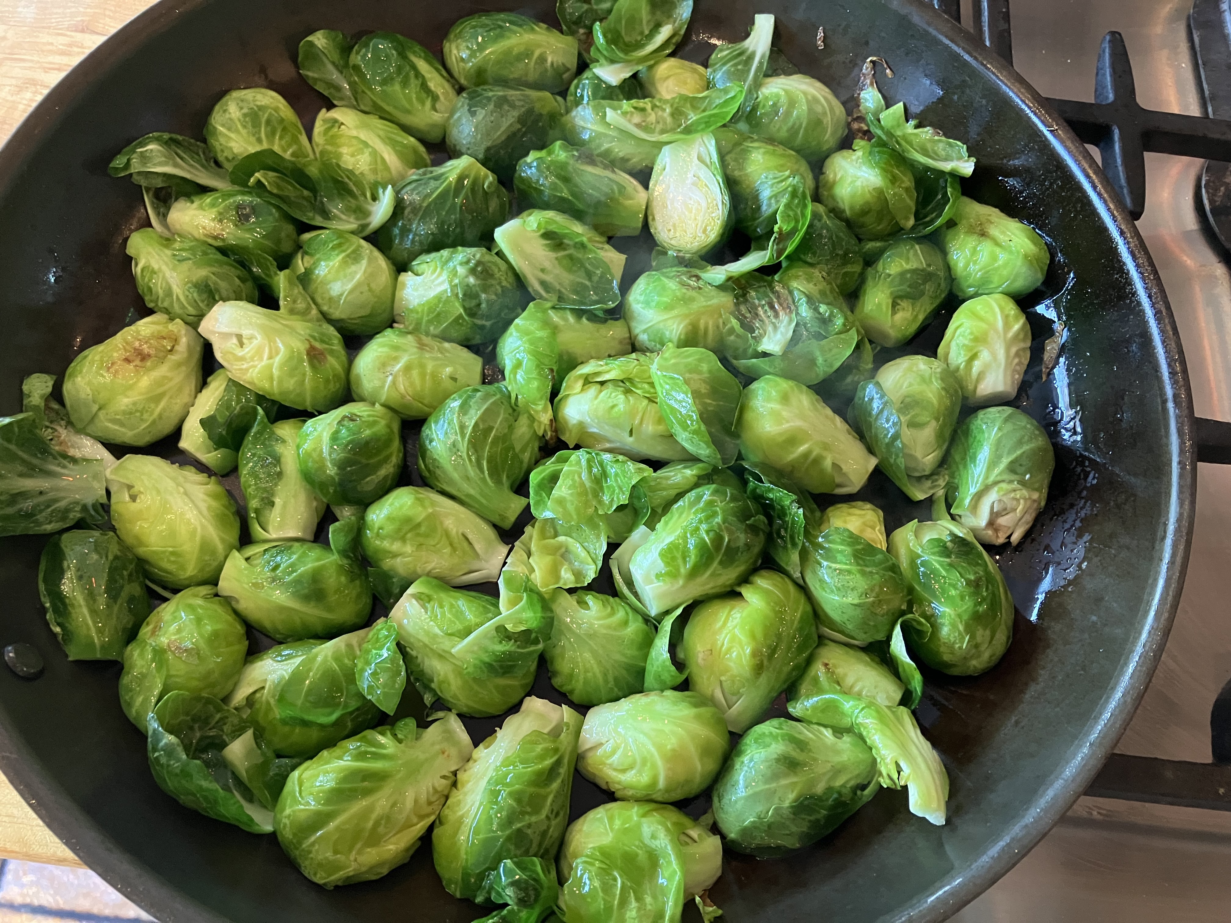 - Turn the sprouts over and make room in the center for the shallots [drizzle a little oil over shallots and cook them until slightly browned—a couple minutes