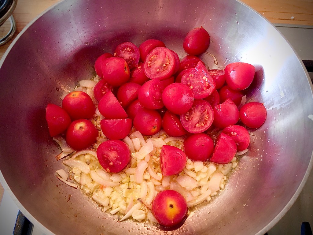 - Sauté the garlic, onions, tomato paste, and anchovies in olive oil until onions wilt, a few minutes