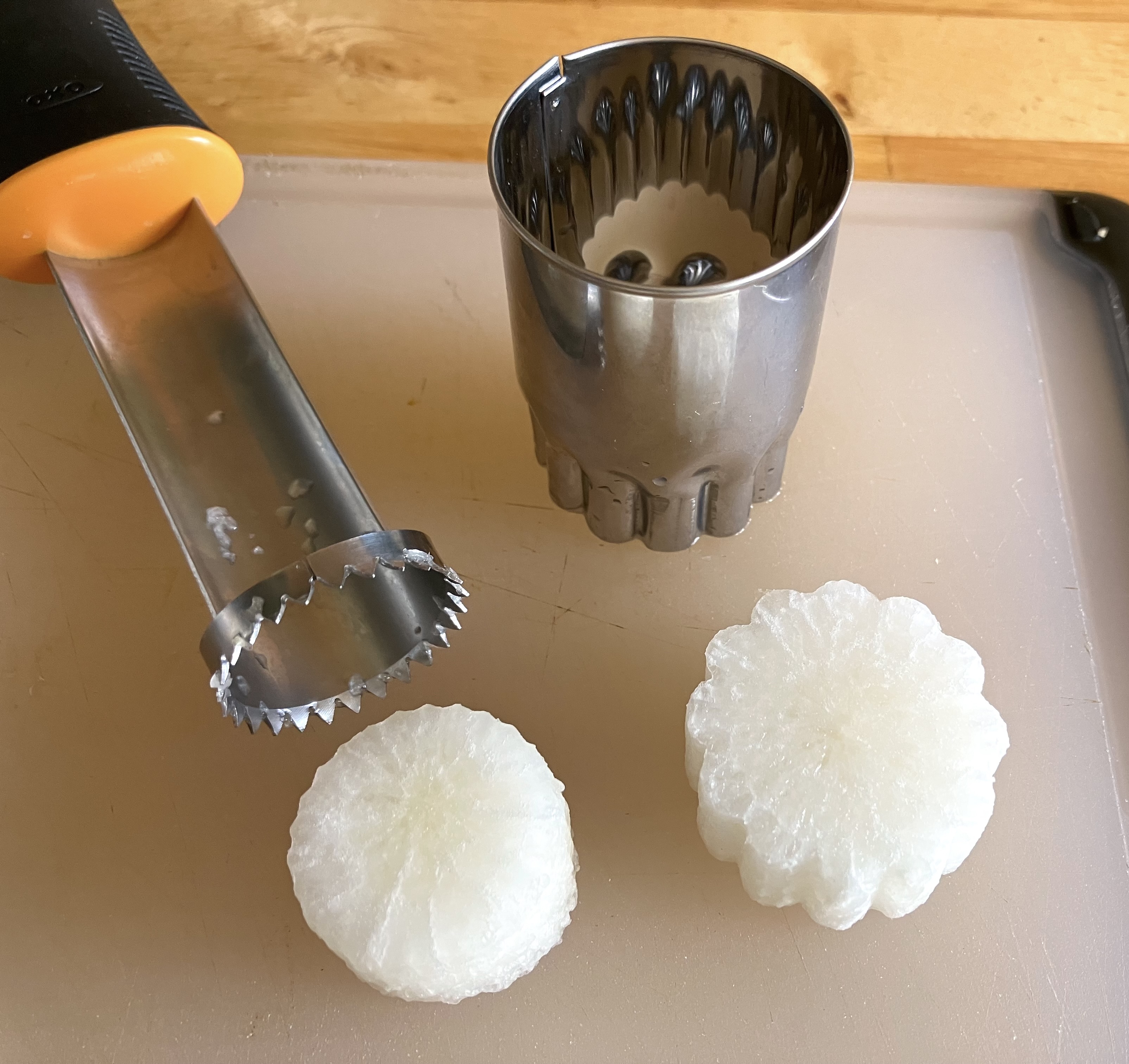 If you can’t find “carrot” shaped daikon, use an apple corer or cookie cutter to create scallops