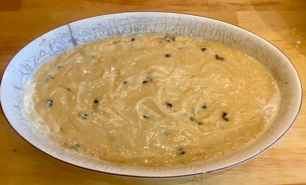 - Oil or butter a 9 x 9 baking dish then dust with some flour; or use baking spray [use about 80 square inch pan of any shape]