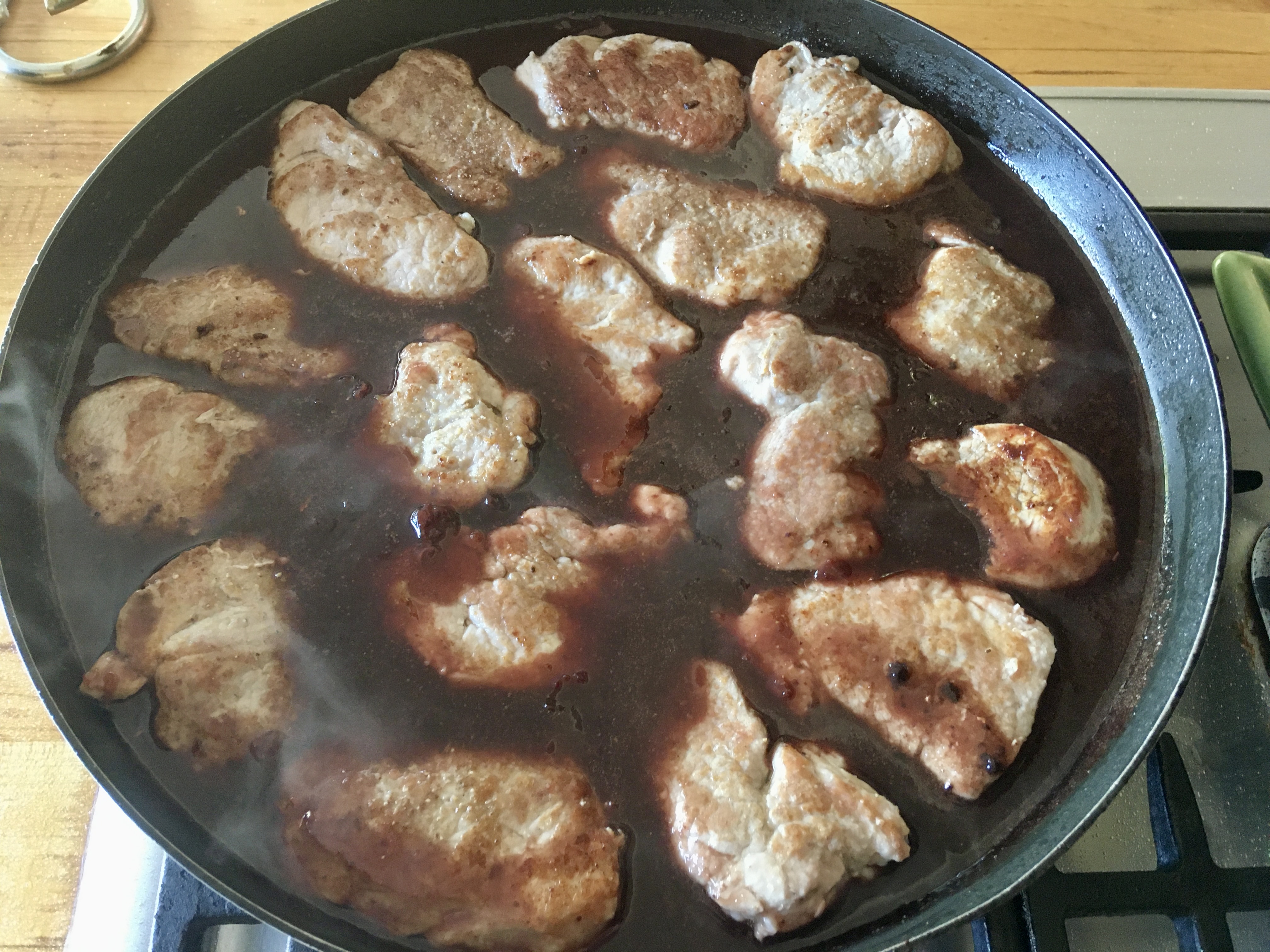 - Don’t move or touch the pork for 3 minutes, then check one to see there is a good browning; if so flip and repeat for 2 minutes; look for doneness at 137-140º, then remove from the skillet along with the pan juices