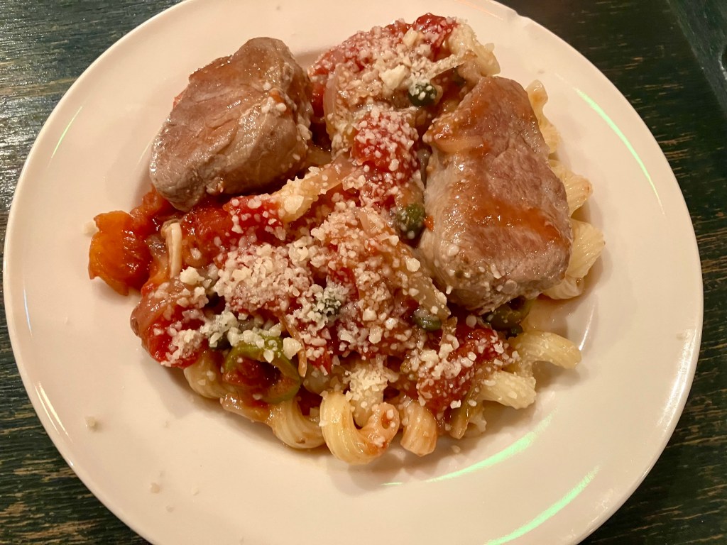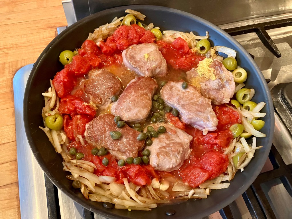 I adapted one of my favorite eggplant dishes for this pork cut. I love the taste of capers, tomatoes, and lemon.