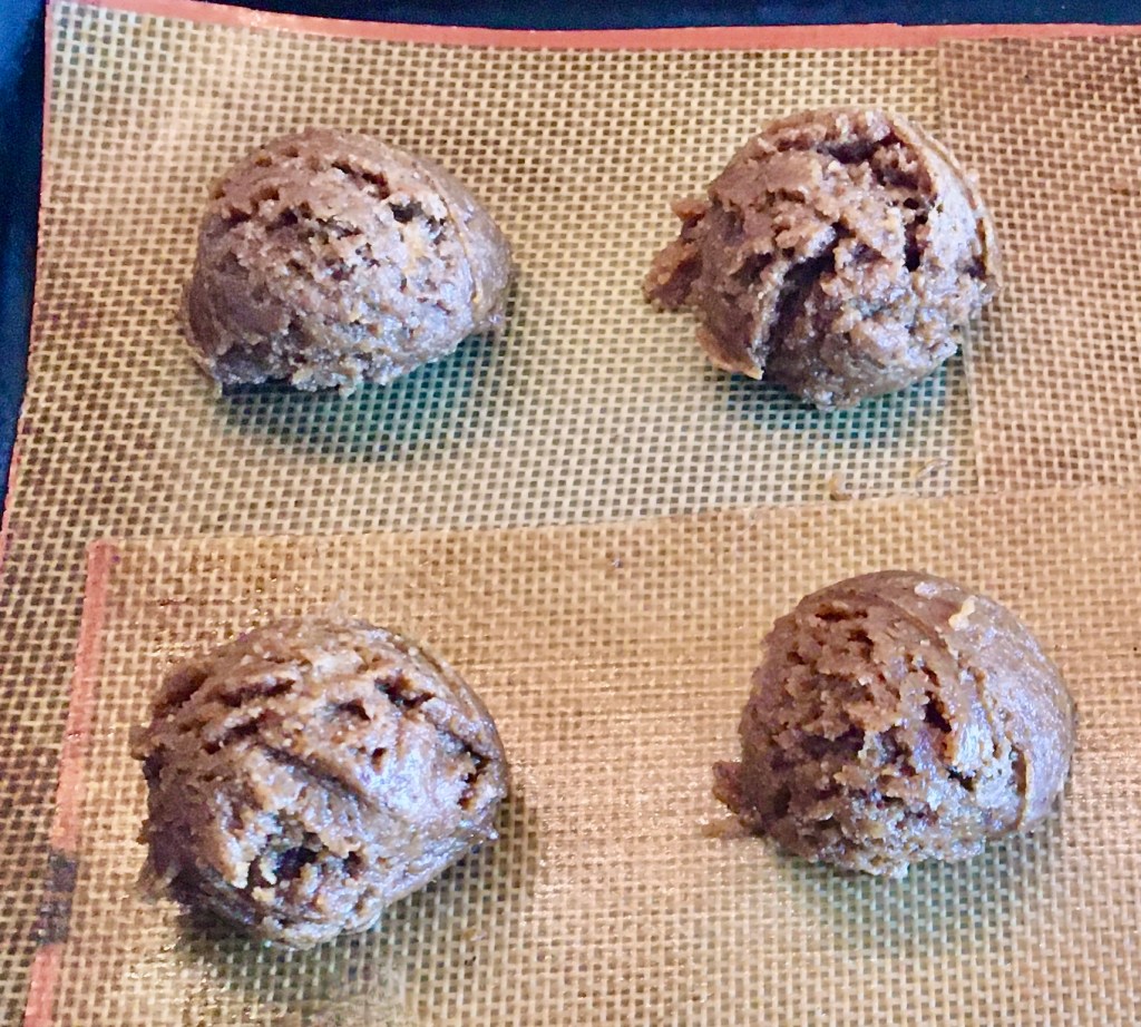 - Place 2 tablespoon size balls about 2 inches apart and flatten with a fork in a cross hatch pattern