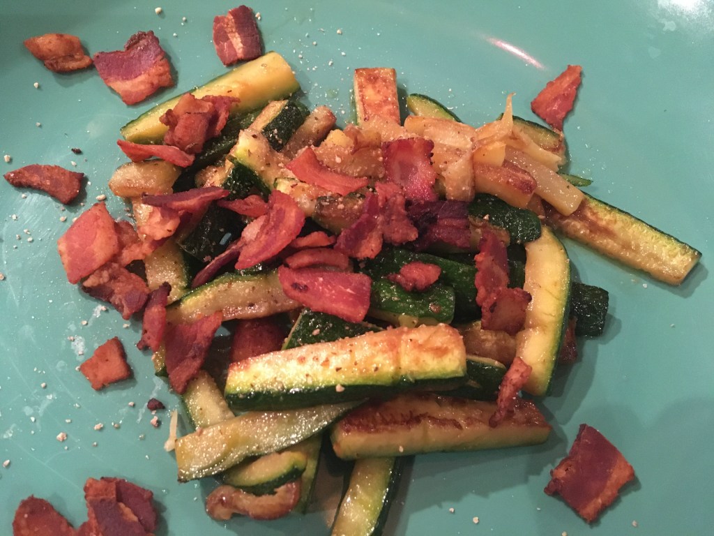 - Add olive oil to the pan with the bacon fat and sauté the zucchini until it begins to brown, 6-8 minutes [sprinkle an 1/8 tsp of baking soda in the skillet first to promote browning]