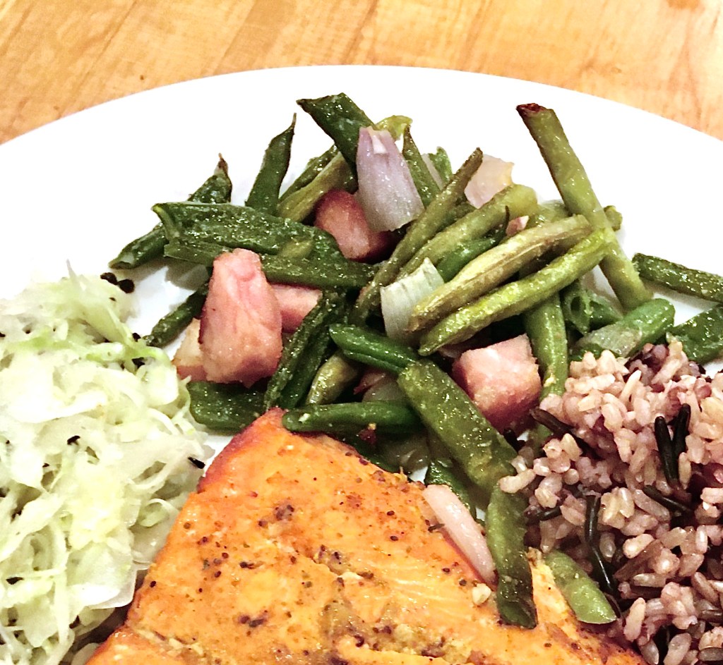 This version stands out; you toss the beans in oil and lay onto a sheet pan and then sprinkle the ham and onions on the top so they brown nicely in about 10 minutes
