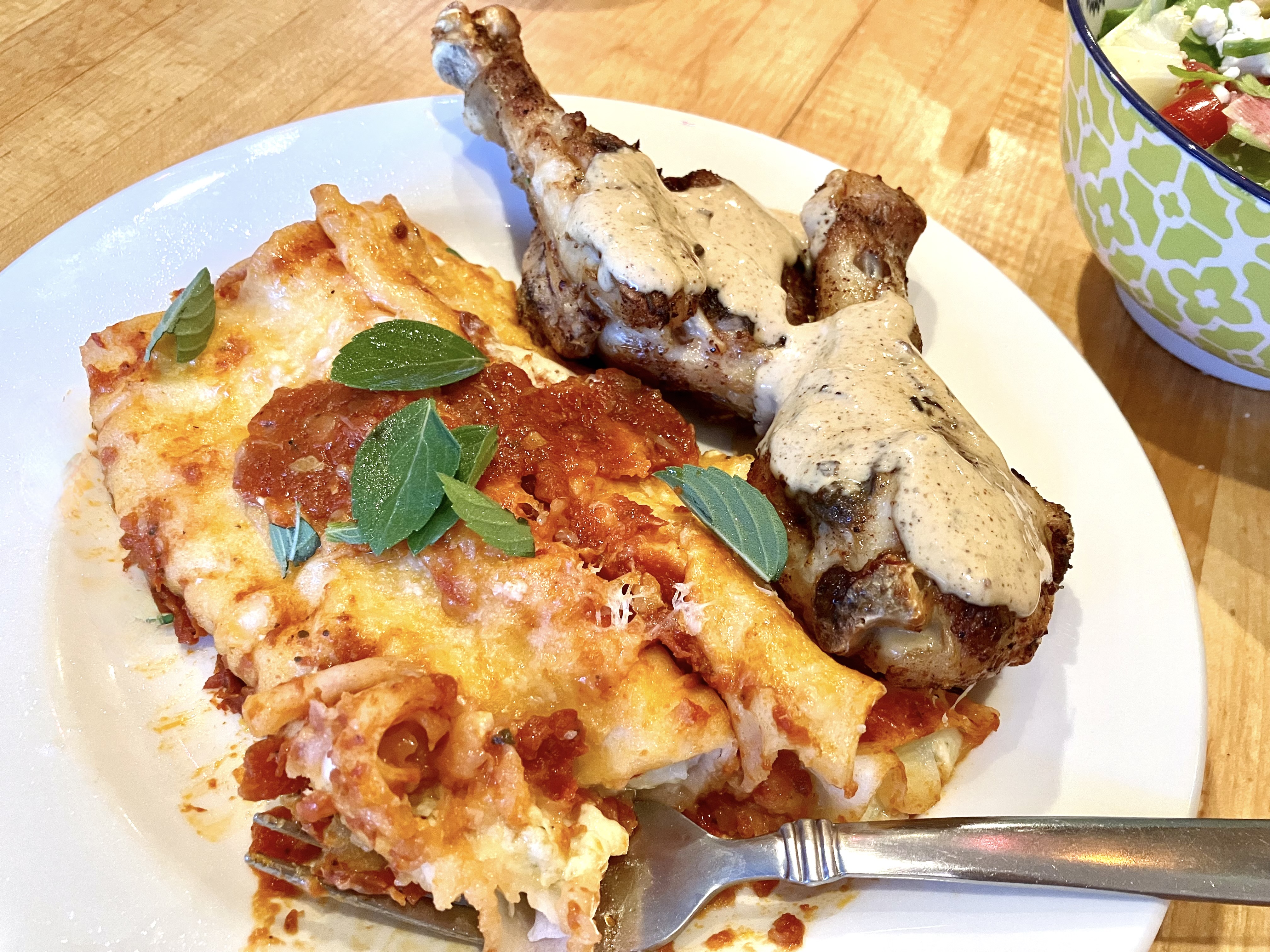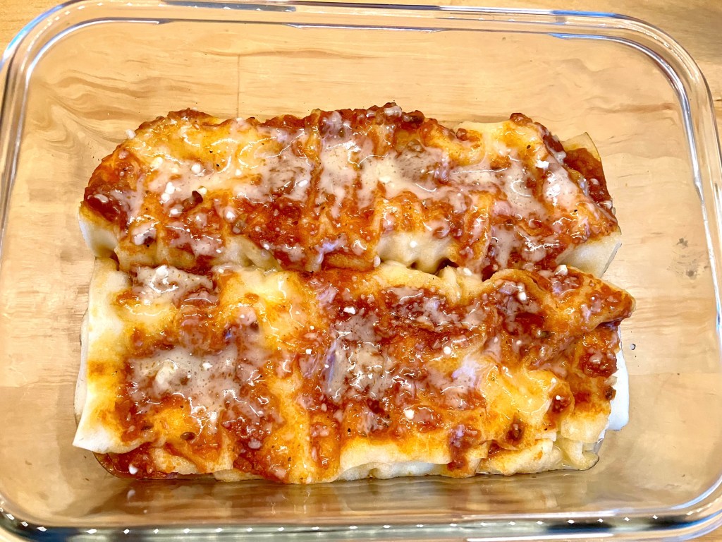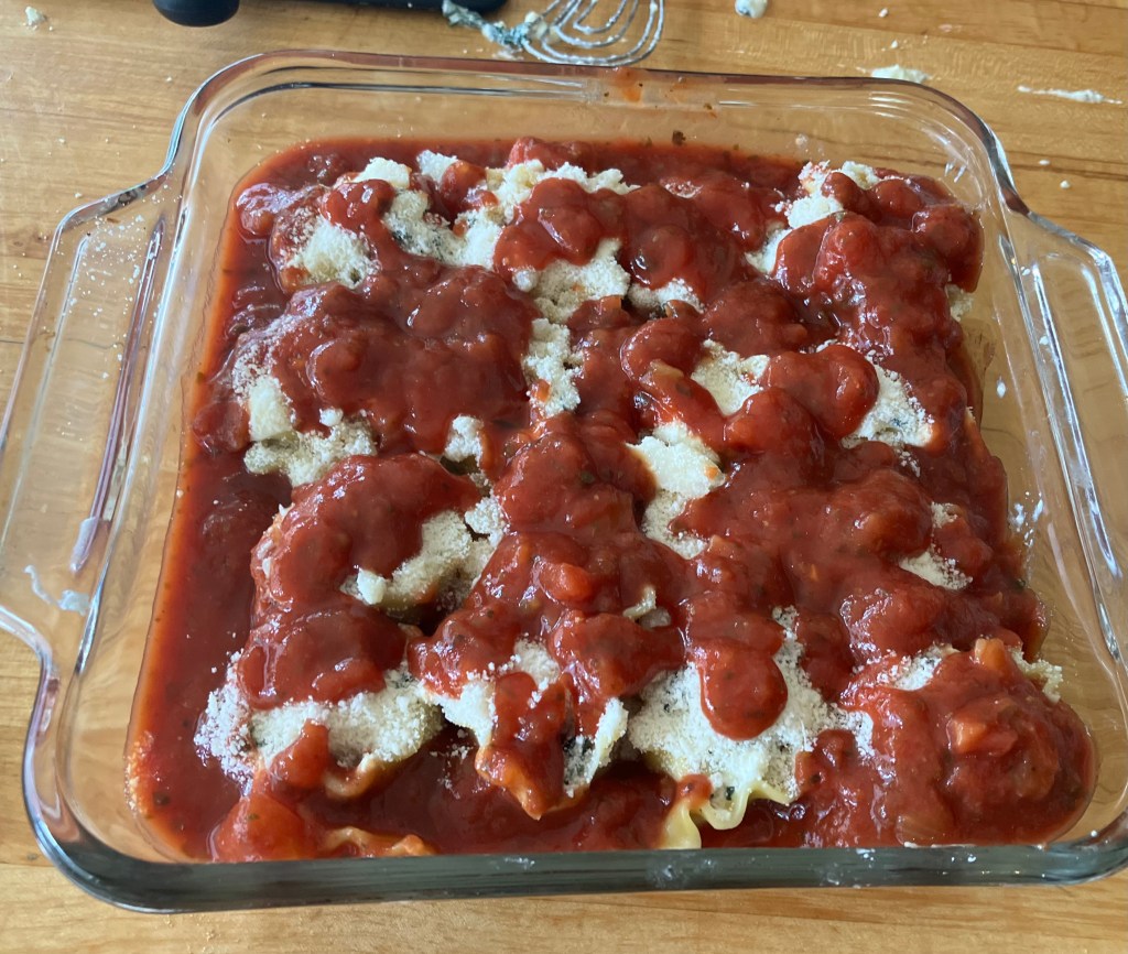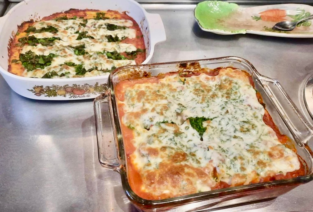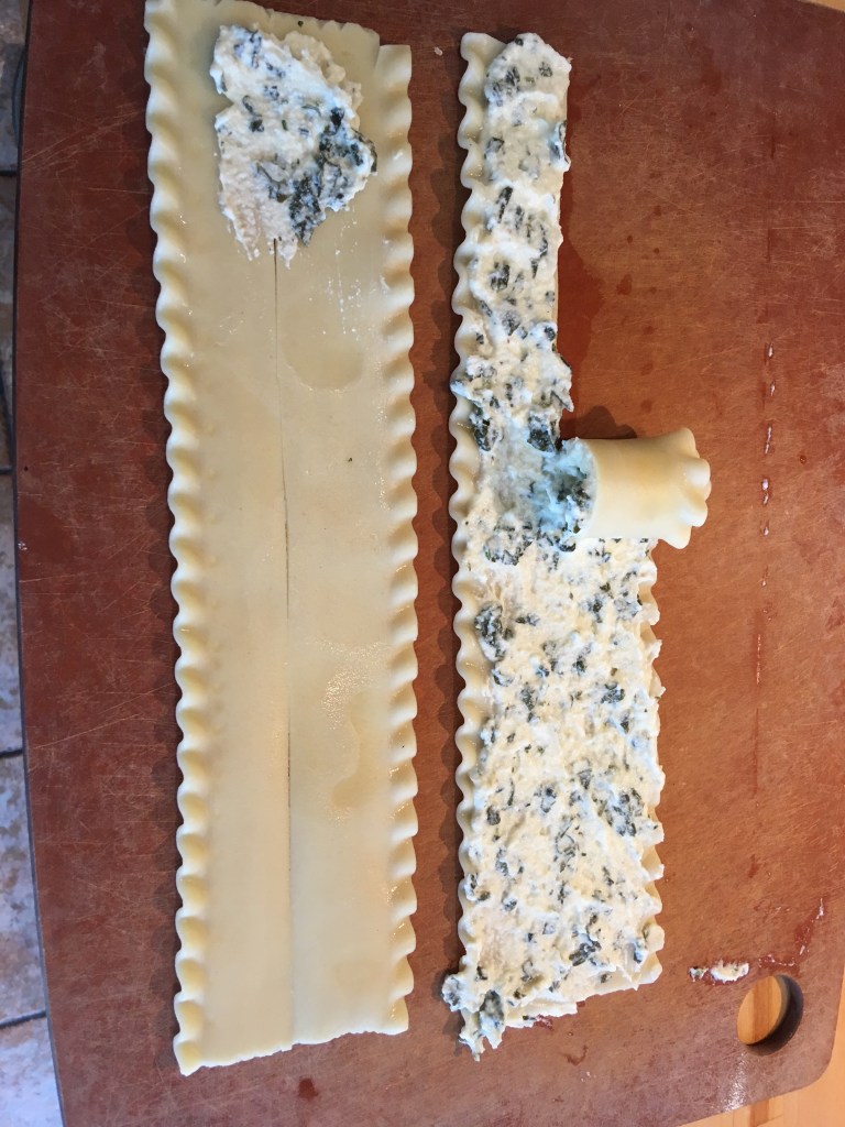 Then I kept the filling simple enough to be used for either lasagna or manicotti, and I did some other hacks like using cottage cheese for ricotta, and Asian spring roll wrappers for the crepes. Now it’s a nice afternoon working with a friend or two to make a big batch and continue a traditional in my kitchen.