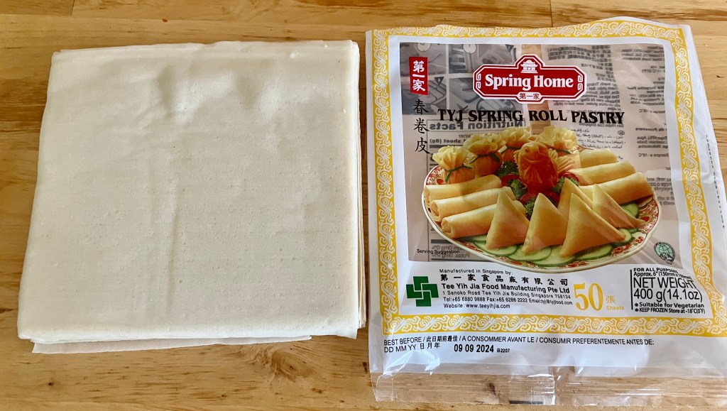 - Peel off two spring roll wrappers and lay flat on your board. We are doubling the wrapper as they are so thin, this will give better structure