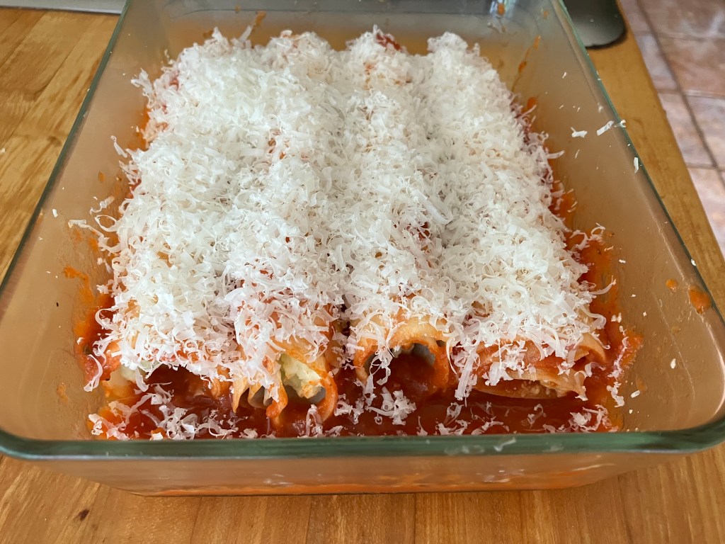 - Pour on additional marinara to lightly cover the manicotti and sprinkle on the remaining 1/4 cup of parmesan and cover with foil