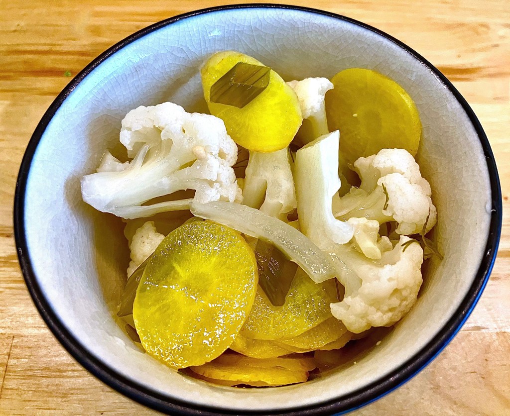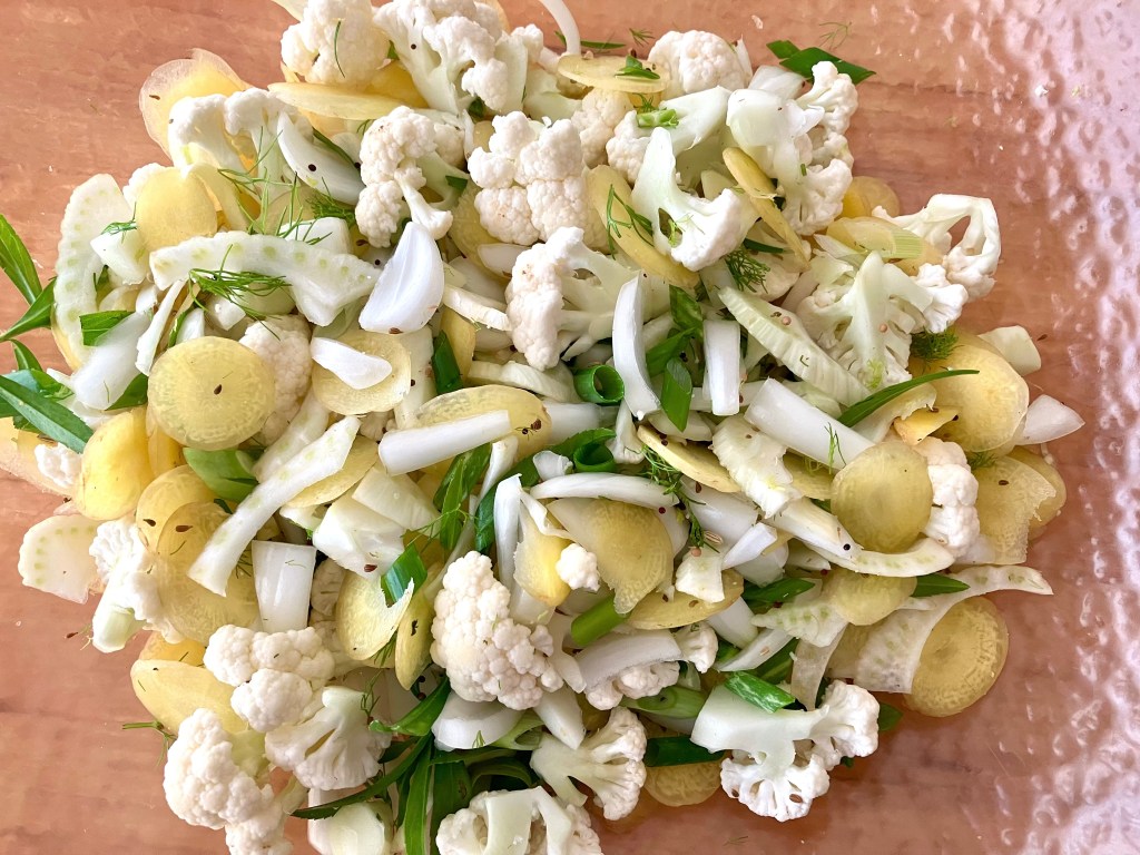 Note: For the size of recipe I want to ferment—whether 1 pint, 1 quart, or half-gallon, I do this hack to save time. Fill your chosen jar with water and then pour it into a large bowl. Use a grease pencil or piece of tape and mark the waterline on the bowl. Pour off the water and now your bowl is ready for your cut up produce. As you cut each ingredient, toss it into the bowl and keep adding the other ingredients until it reaches the mark. Next, toss everything right in the bowl before you add it to your fermenting jar. If you are over the waterline mark, use the excess as part of your salad for the next meal!