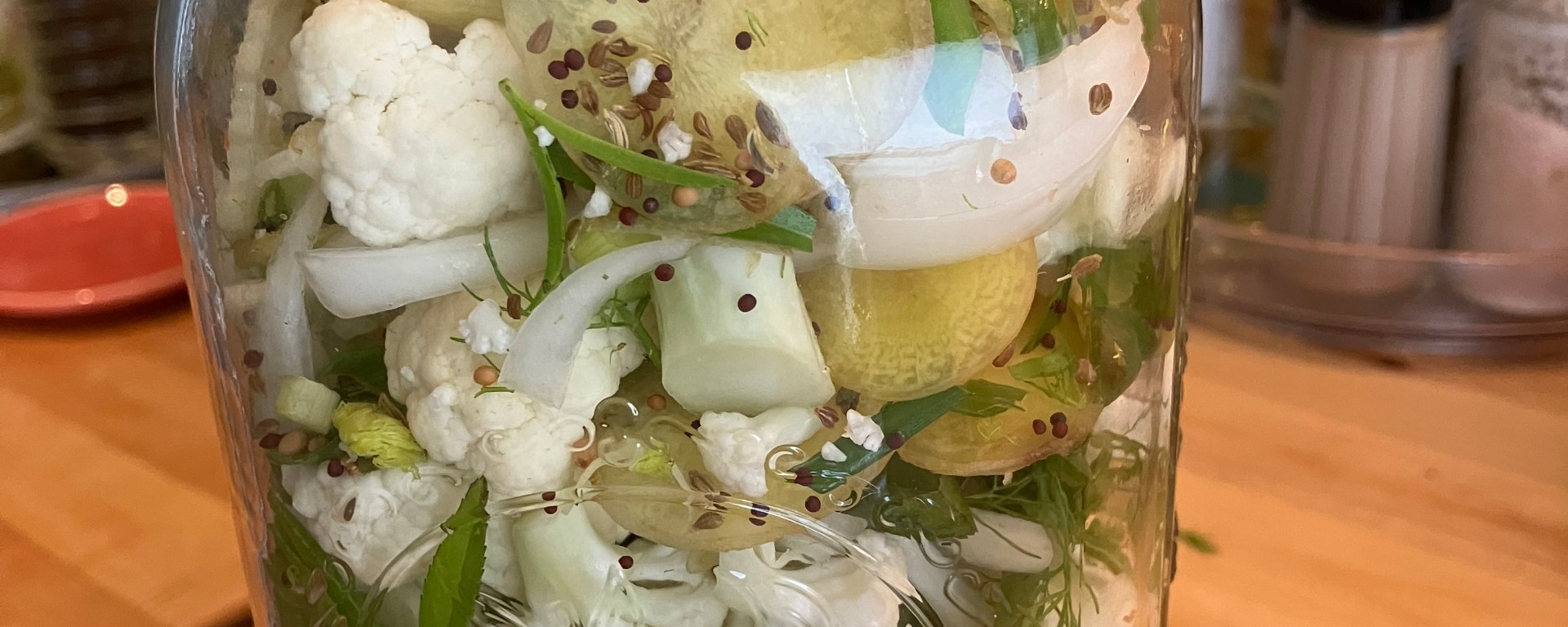 - Add the ingredients to your clean fermenting jar, then pour in the brine until a half inch or so from the lip