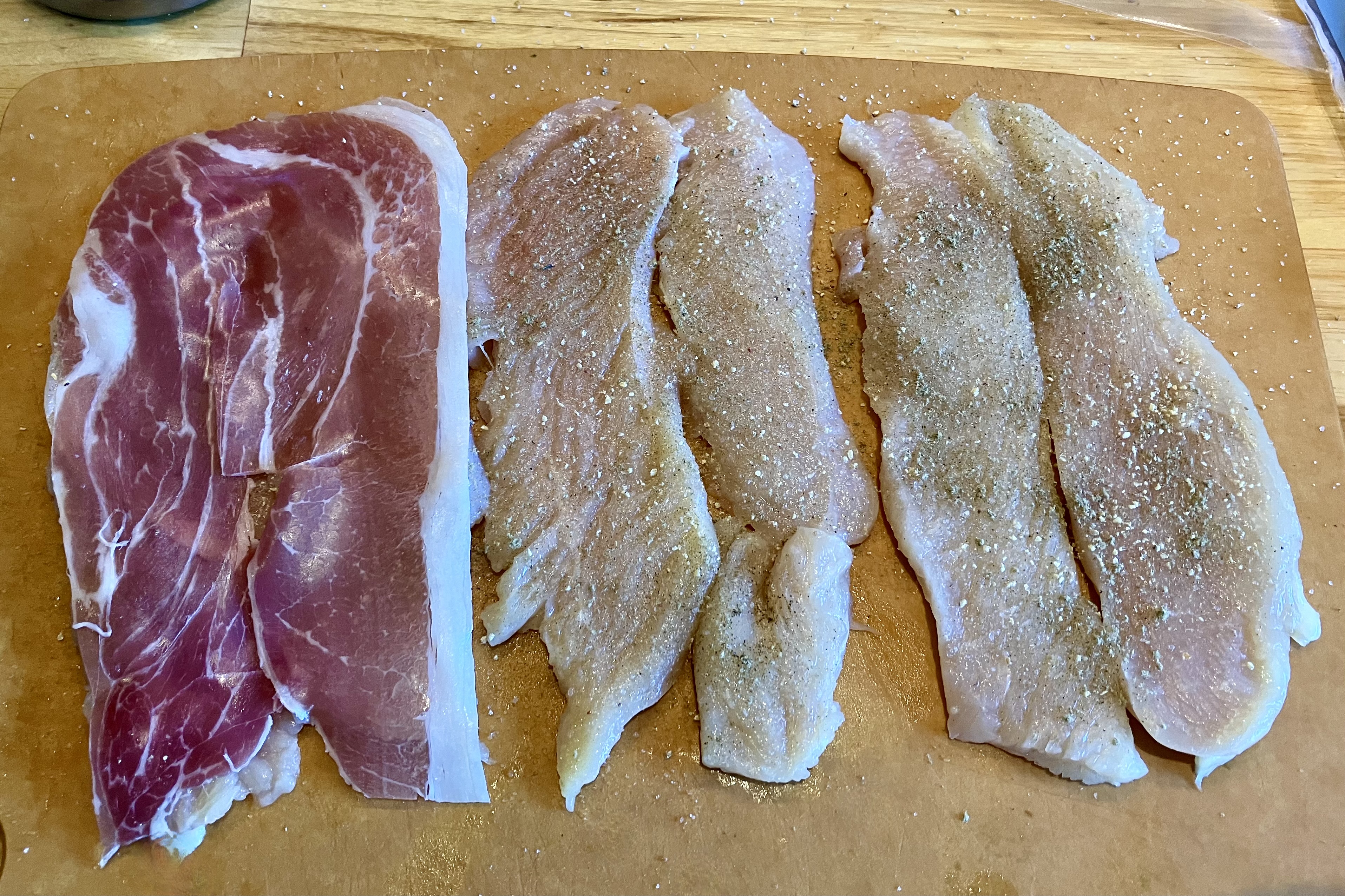 - Lightly season each cutlet with salt and pepper [the prosciutto is salty]