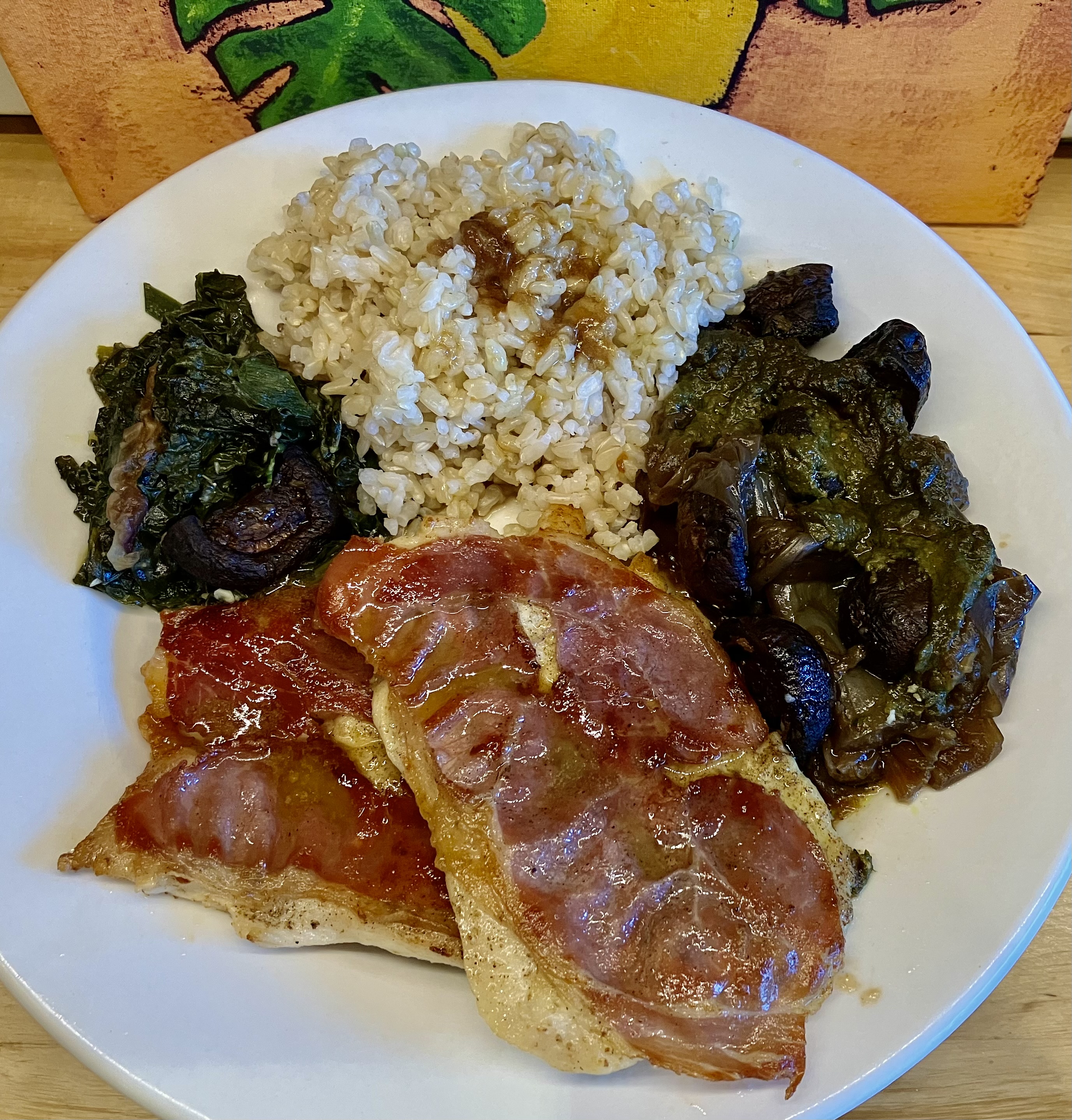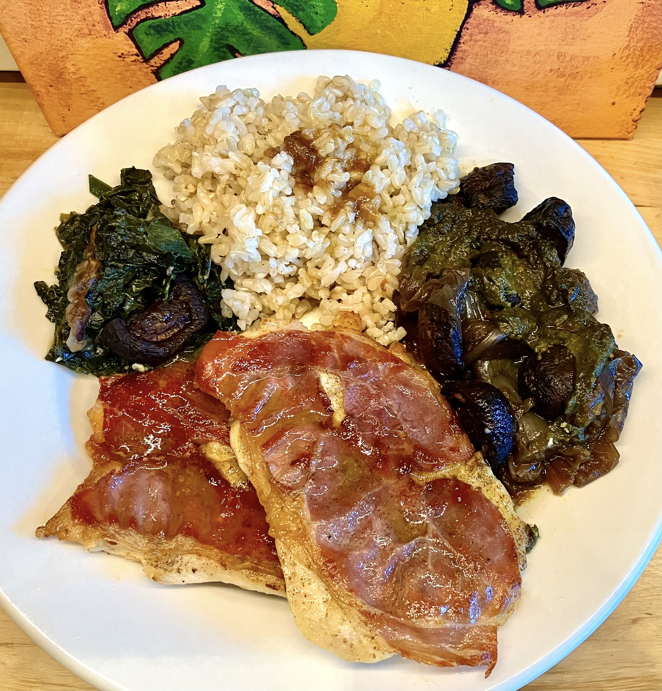 PHOTOS: I pounded chicken tenderloins and arranged them so the prosciutto will cover and bind them in the sauté stage. Served with sautéed mushrooms, brown rice, and braised kale