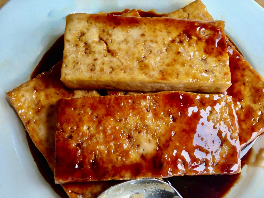 - For tofu: drain and slice into 1/4″ sections then press in toweling using a heavy pan for 15 minutes—you do not need to pound tofu
