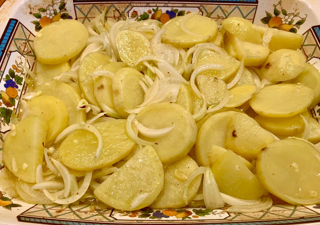 - Toss potatoes with the olive oil, salt, pepper, onion, and garlic and place in a 9 x 13 casserole and cover tightly with foil