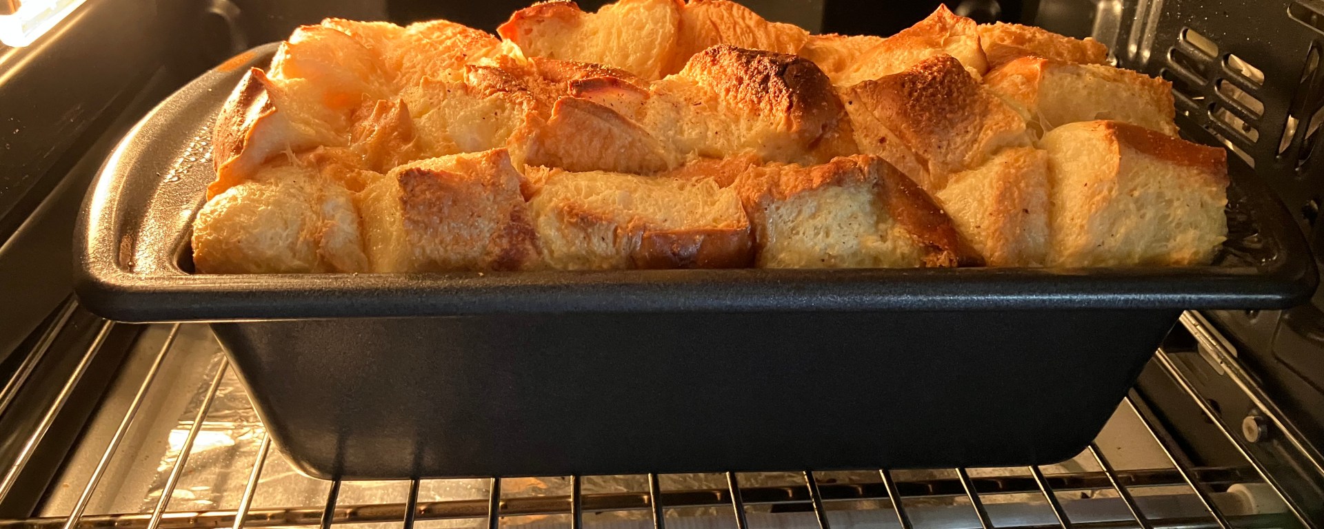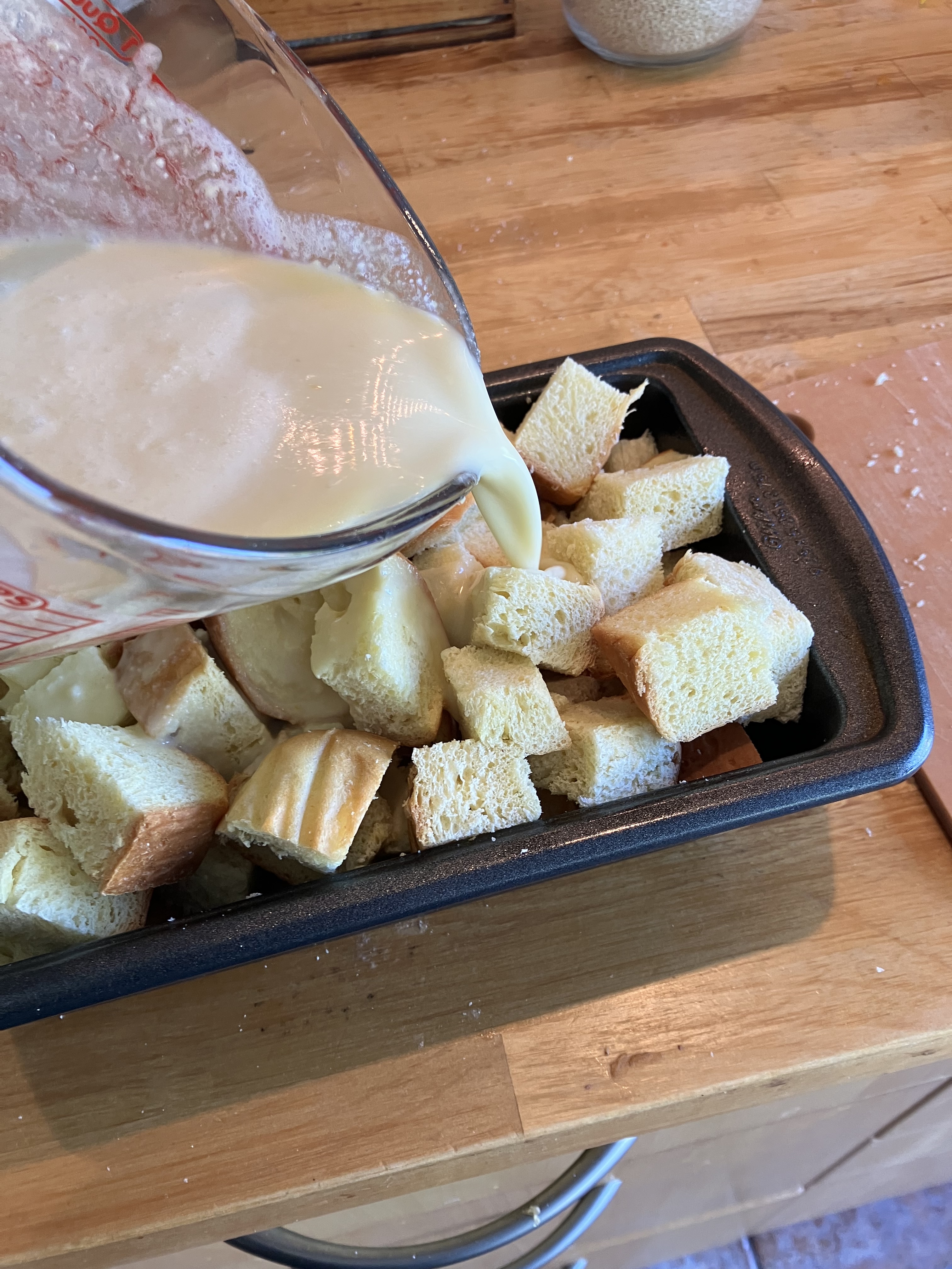 - Cut or tear the bread and place in the pan; pour the custard over the bread and let soak for an hour at room temperature