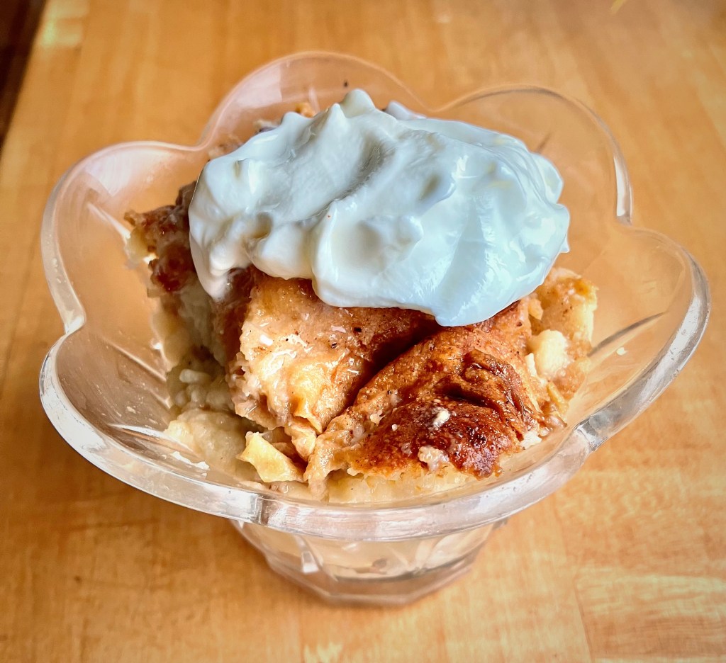Here’s how: skip the ingredients above to make the custard and whisk 2 cups of vanilla ice cream with 2 eggs. That’s it. Carry On! – Recipe by B. Hettig