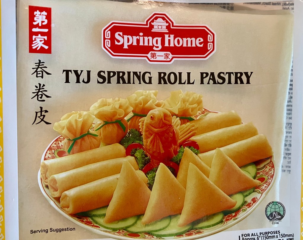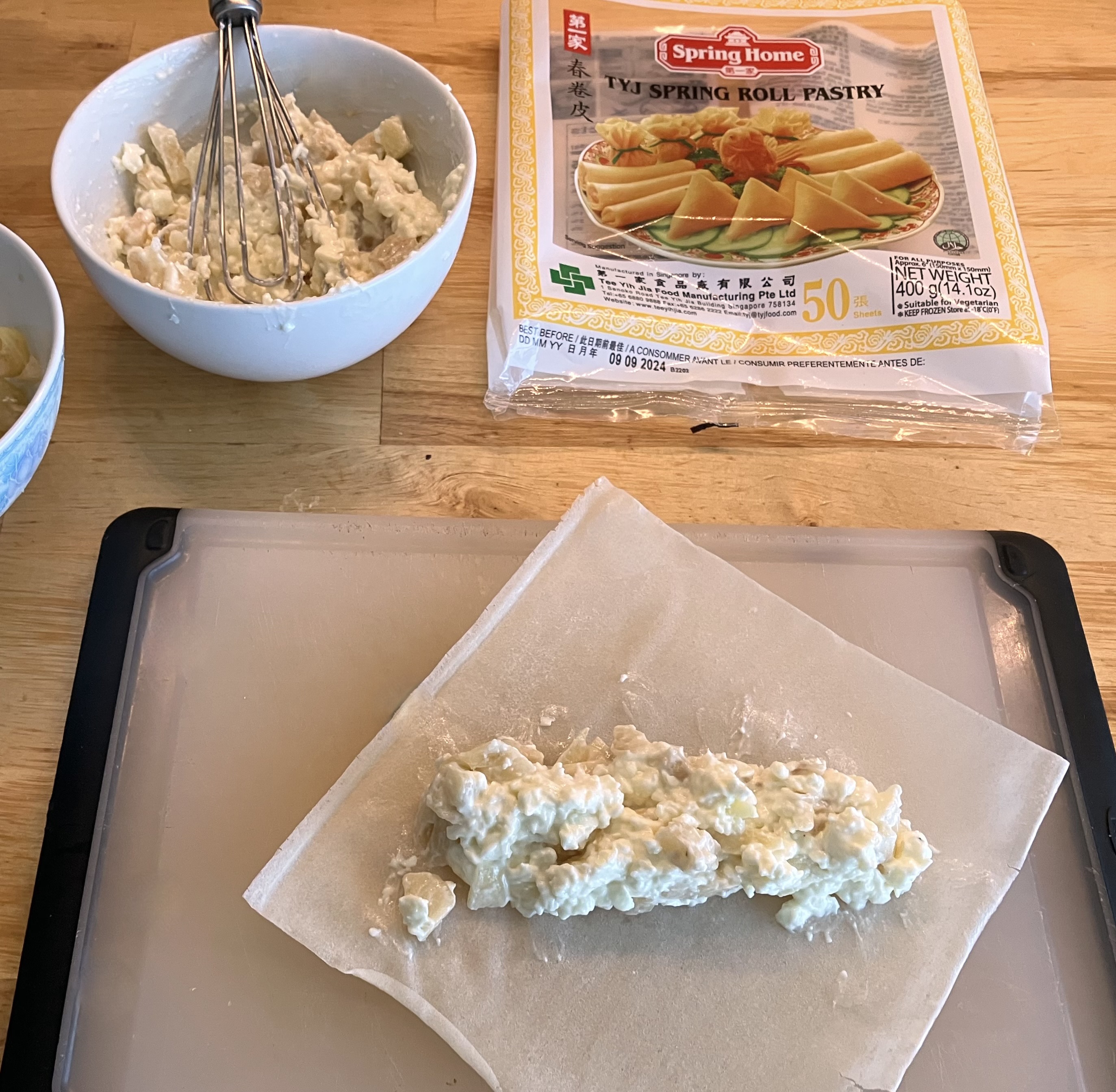 - Open the egg roll wrappers [keep under damp toweling] and lay one on the cutting board