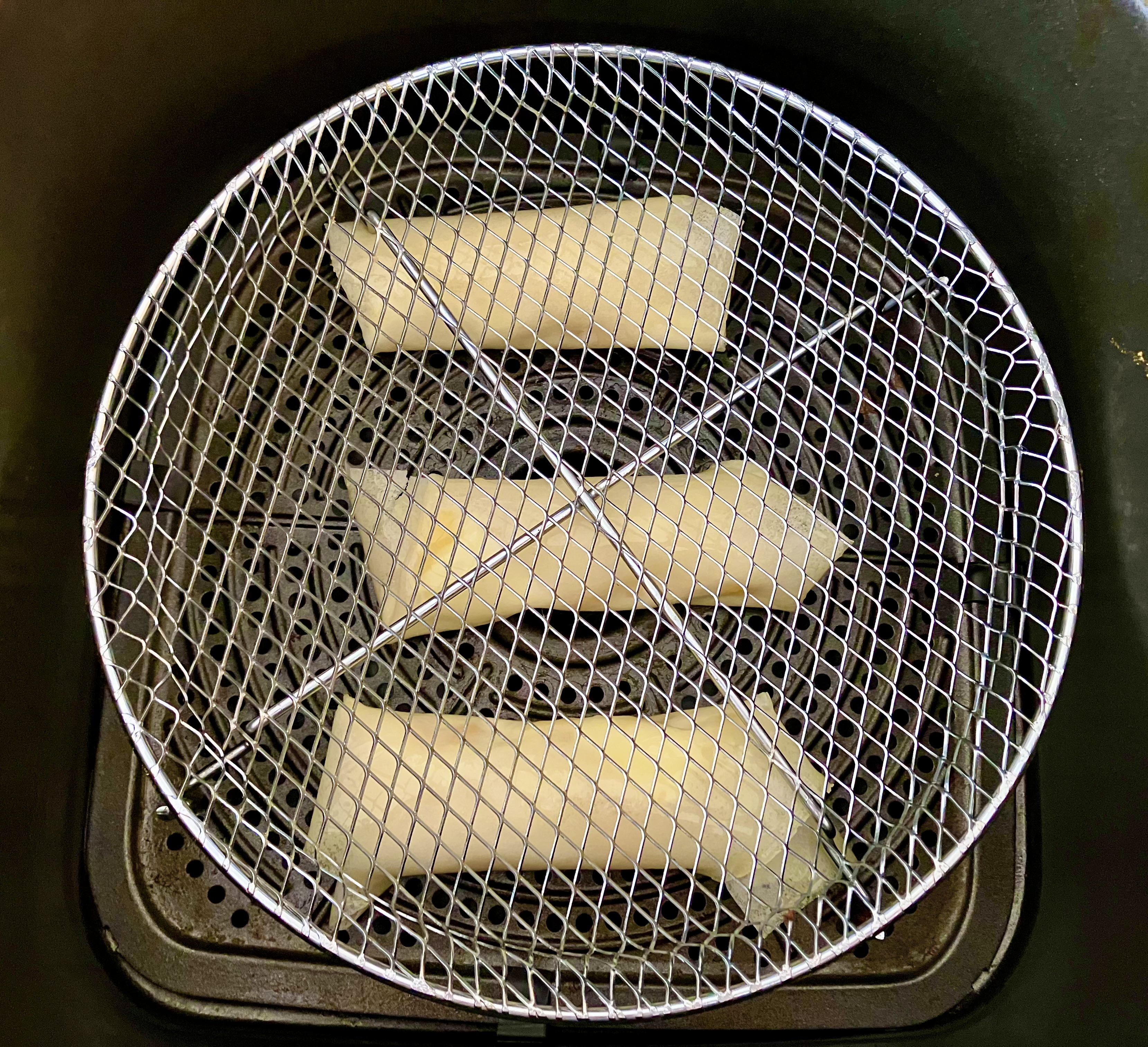 Left: Rolling into cylinders: Right: Using an Air Fryer Basket to Hold Turnovers in Place While Cooking