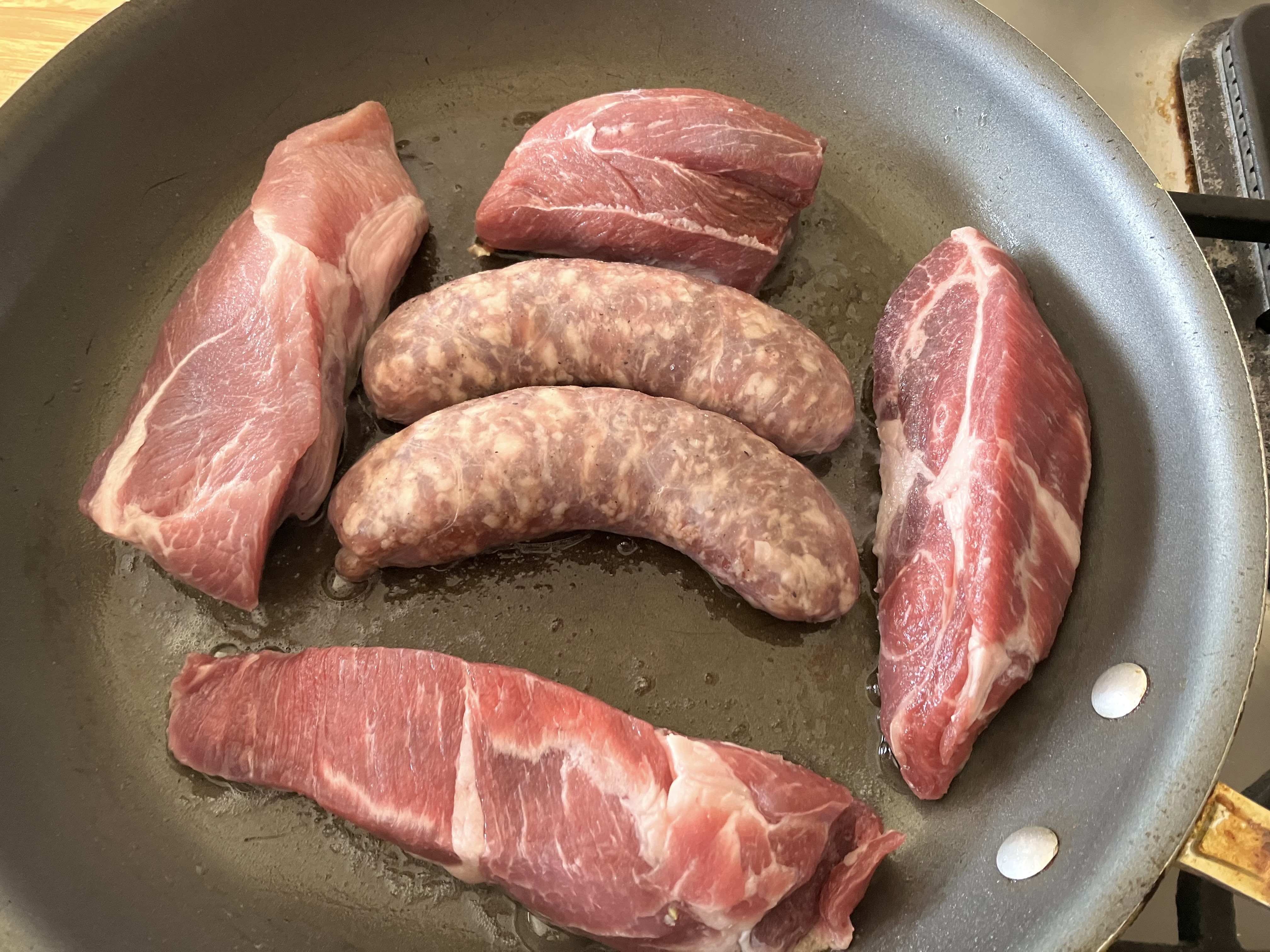 - Dry the pork with toweling and add to the hot skillet and brown on all sides; and remove and reduce heat to medium