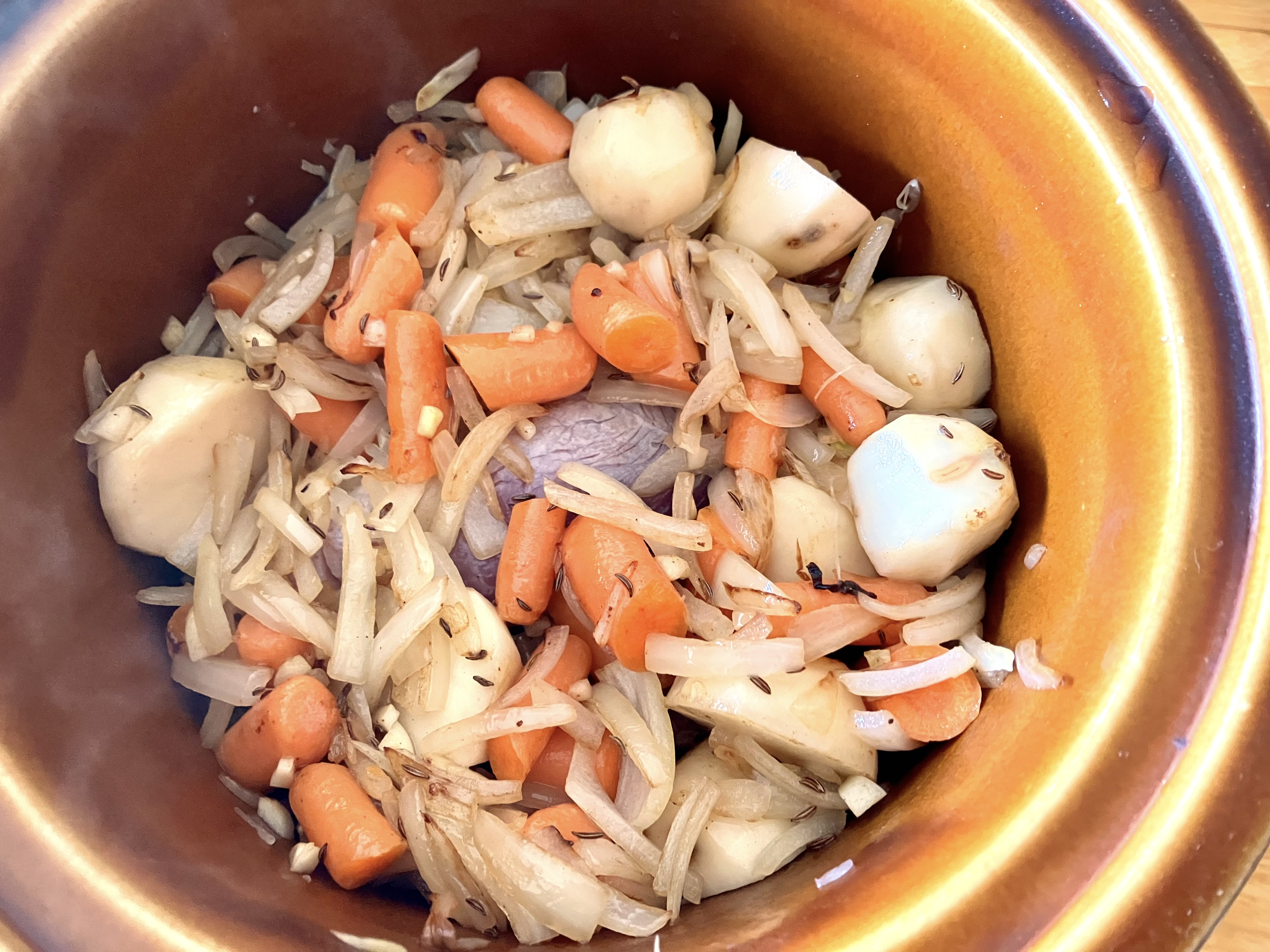 - To the onion mixture add in the sauerkraut in layers with the sausage, pork, potatoes, and carrots