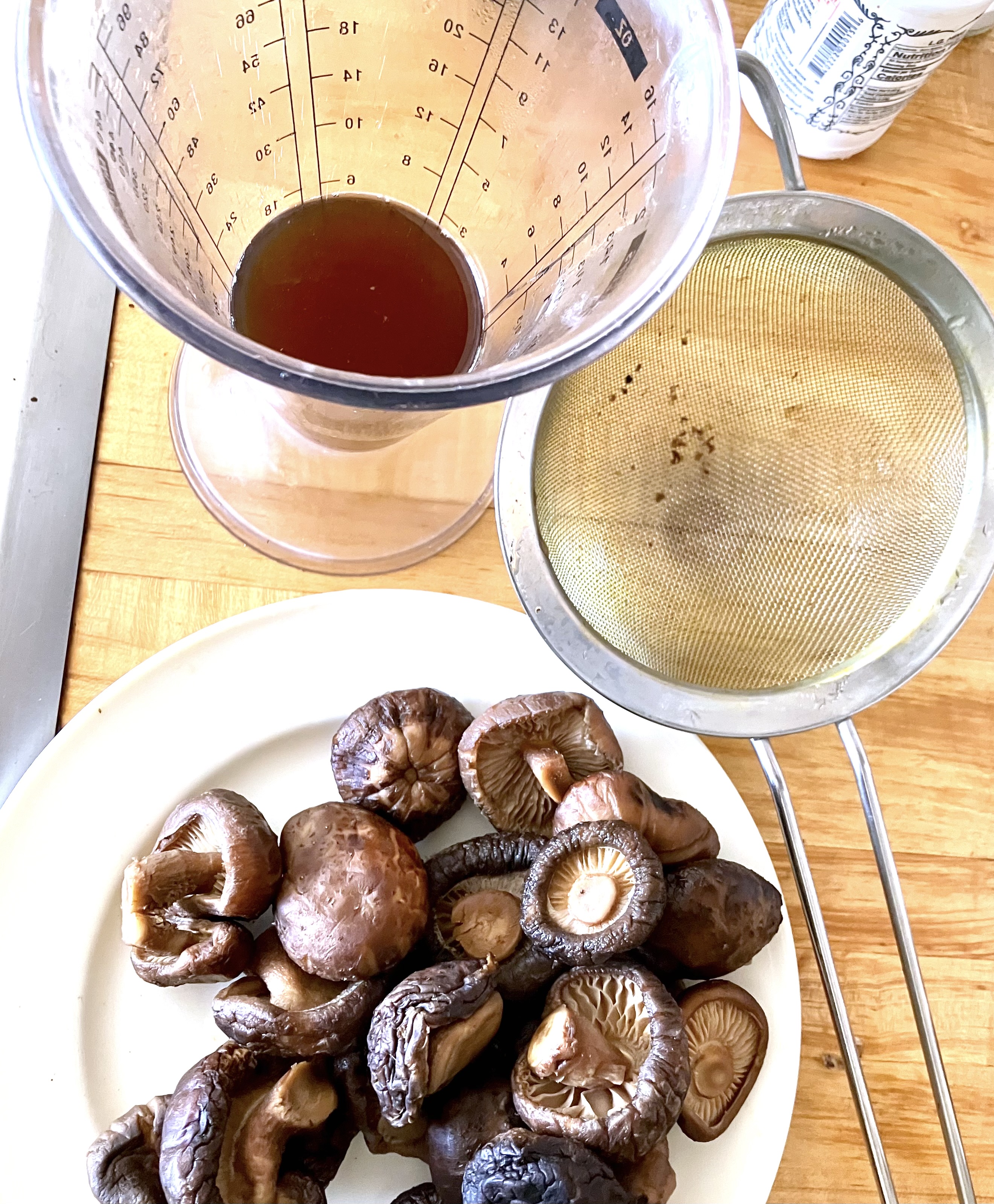 3. Allow mushrooms to cool a bit, then lightly squeeze them over reserved broth