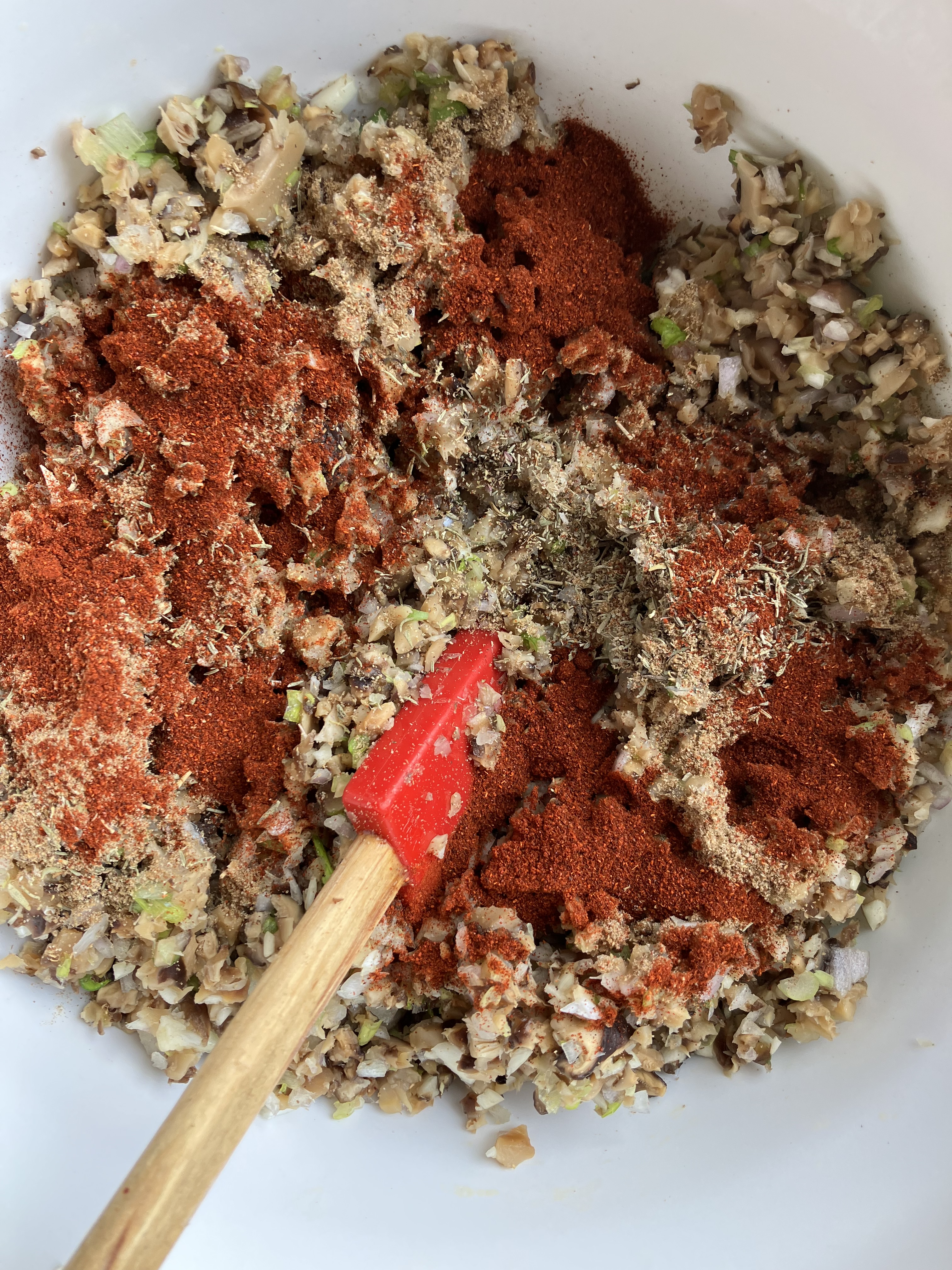 6. Place mushrooms, onions, garlic, and spices in a food processor fitted with a blade and pulse until coarsely ground; don’t over process—just 4-6 one second pulses