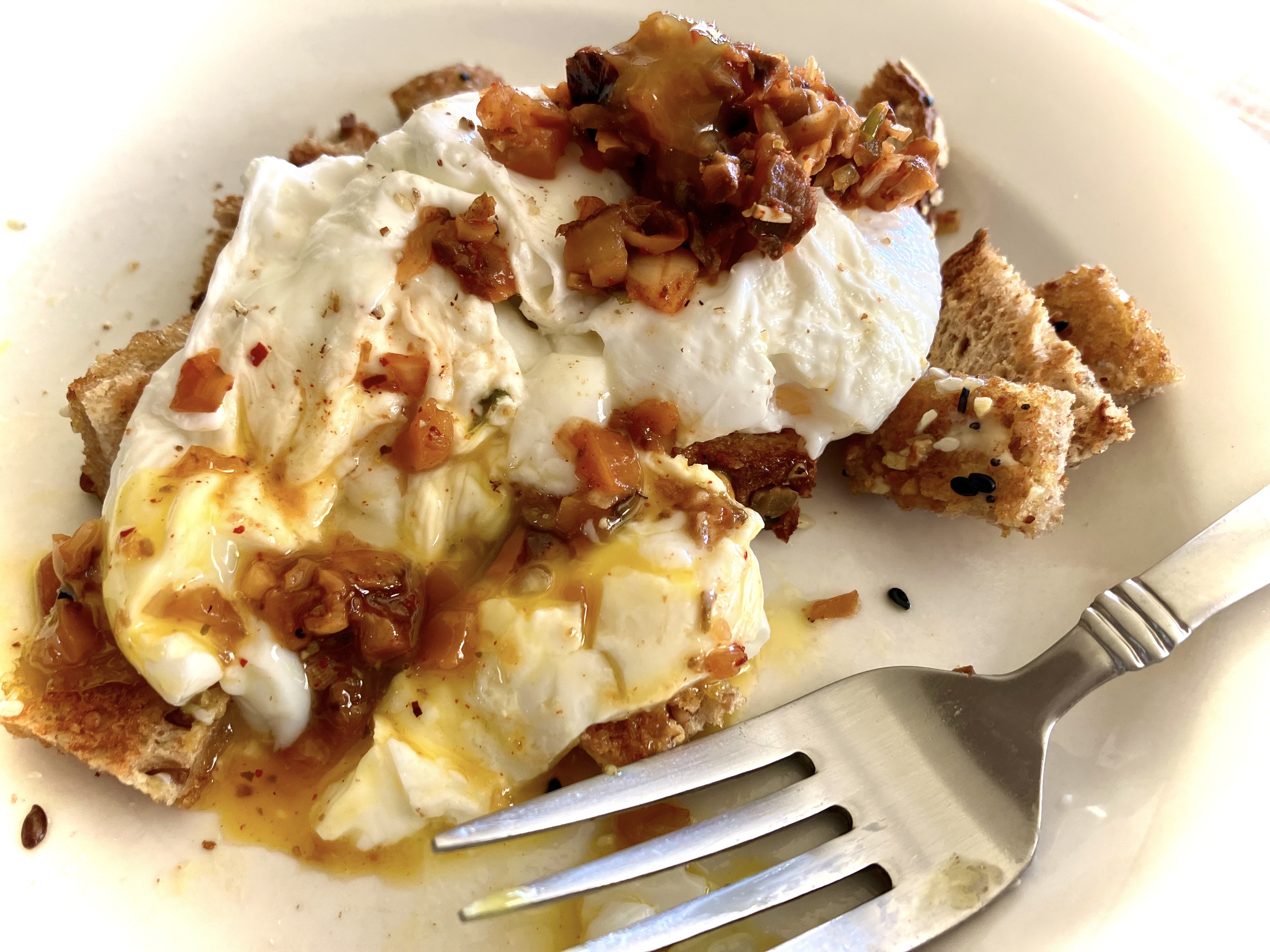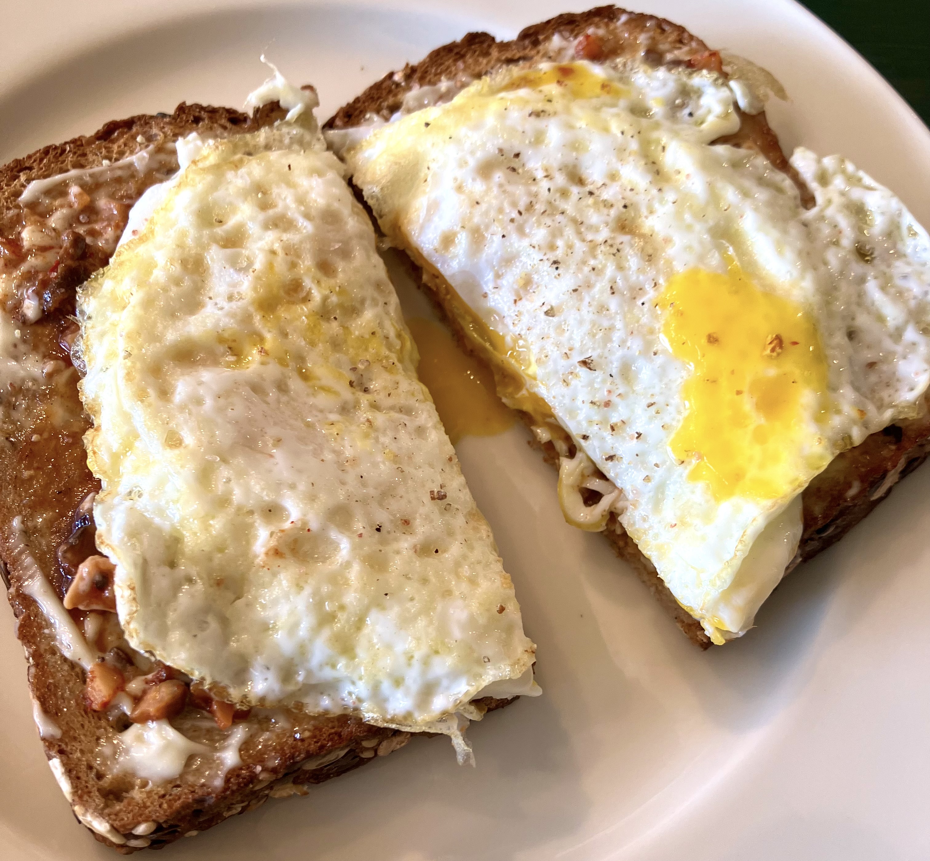 L: Cuban Black Beans Topped with Chorizo & Egg Upper R: Scrambled Eggs Lower R: Poached Eggs on Toast