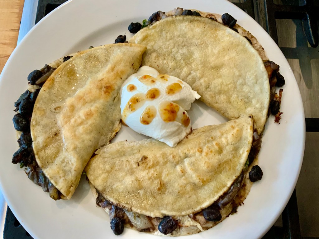 Brazilliant black beans, pecorino cheese, and Mexican Chorizo Quesadilla with Poached Egg