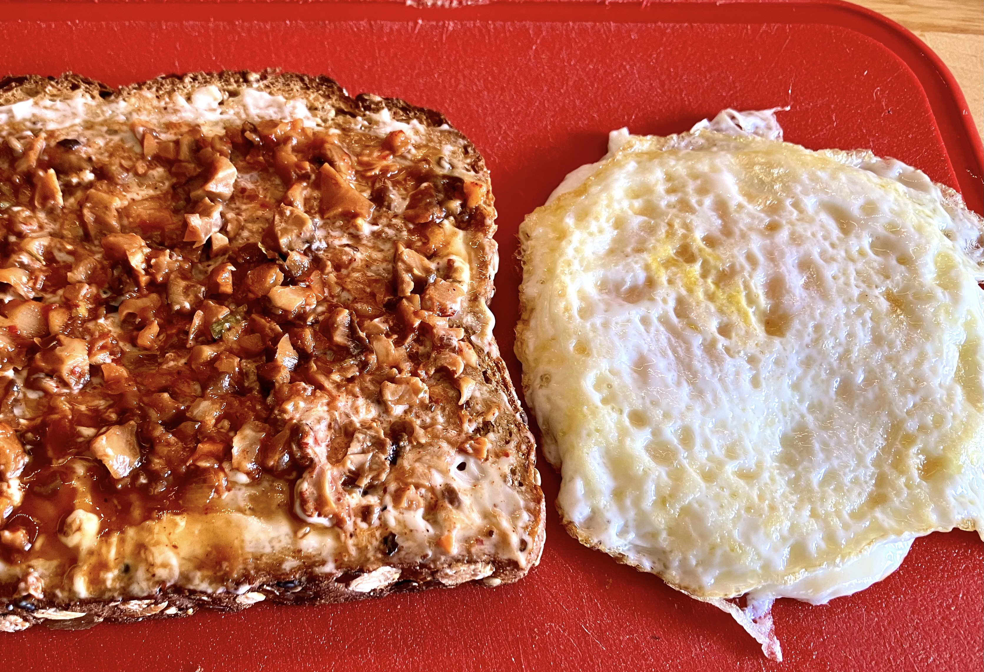 Fried Egg Sandwich with Mayo, BBQ sauce, and Mexican Chorizo