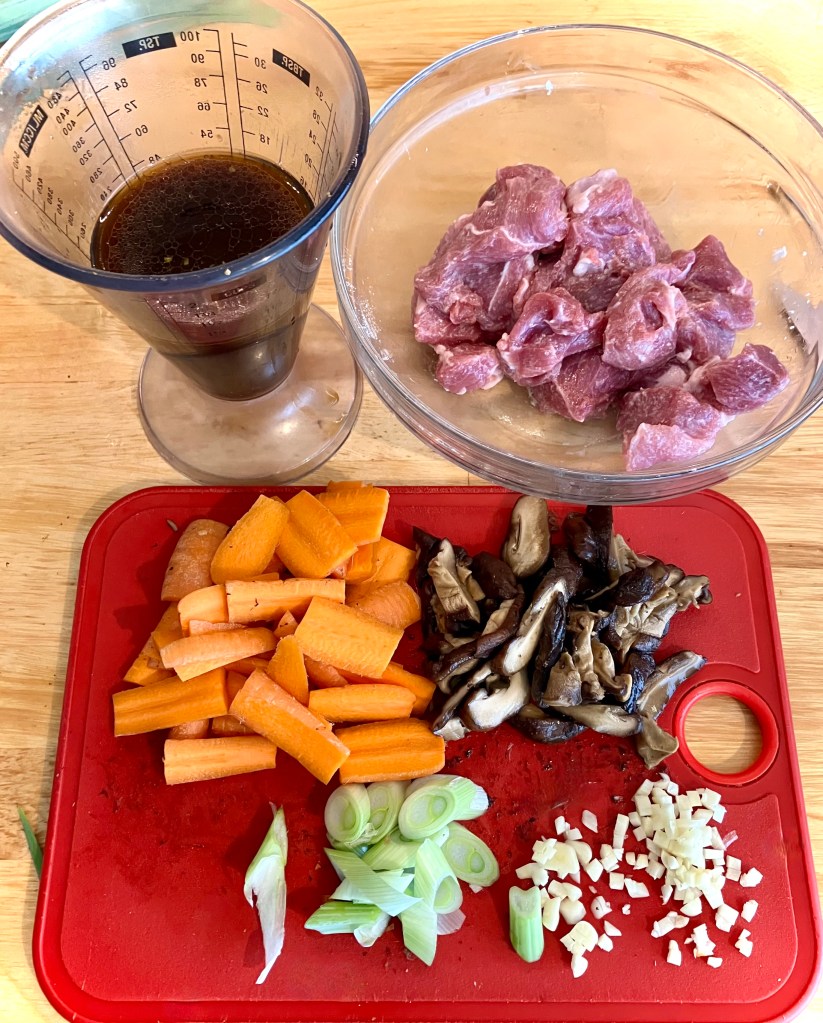 - Cook pork and mushrooms– Heat the pressure cooker and add a thin coating of neutral oil, place pork in single layer and don’t move for 2 minutes; then turn and add the mushrooms, sauté for one minute.