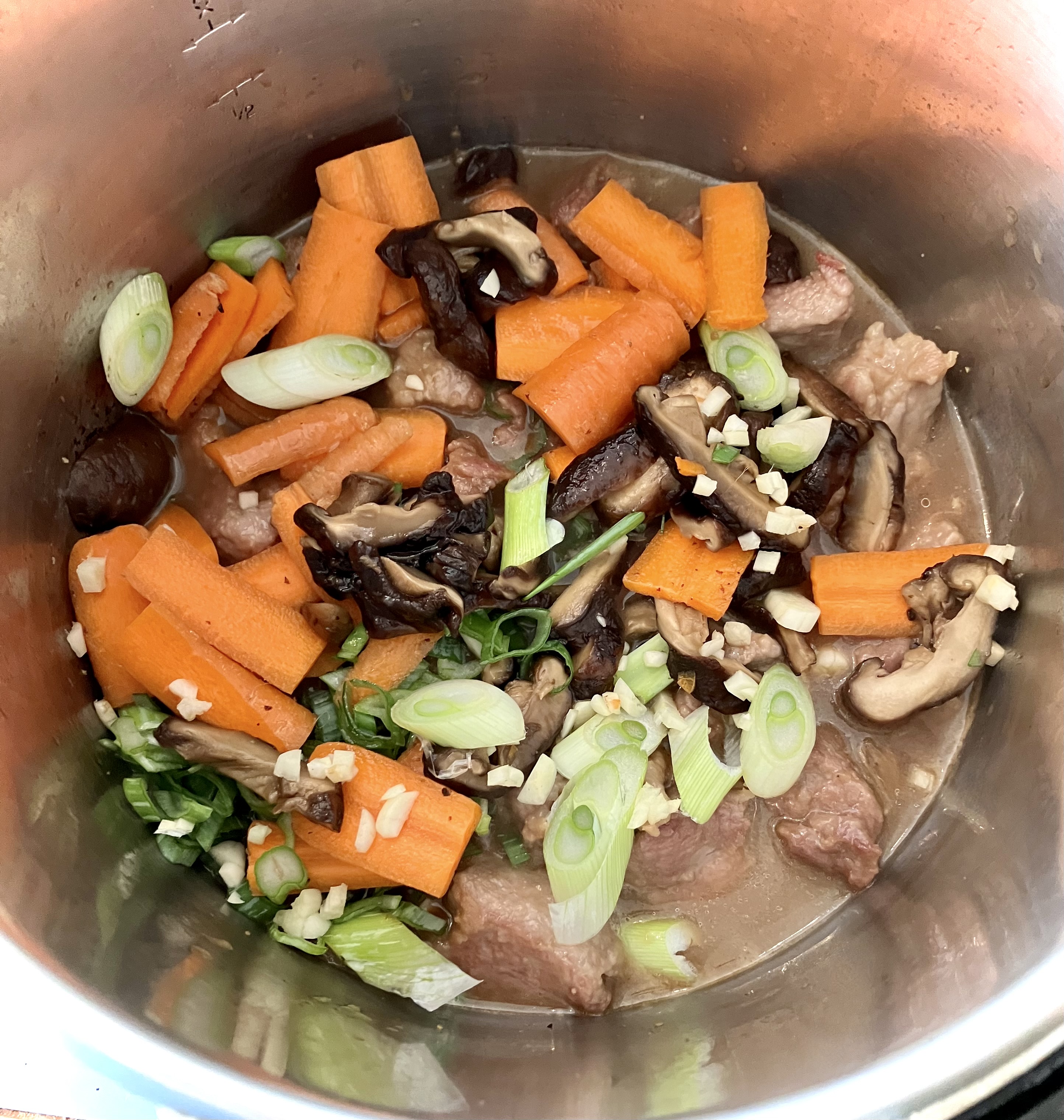 - Add the onions, garlic, and carrots then bring to pressure and cook for 30 seconds.