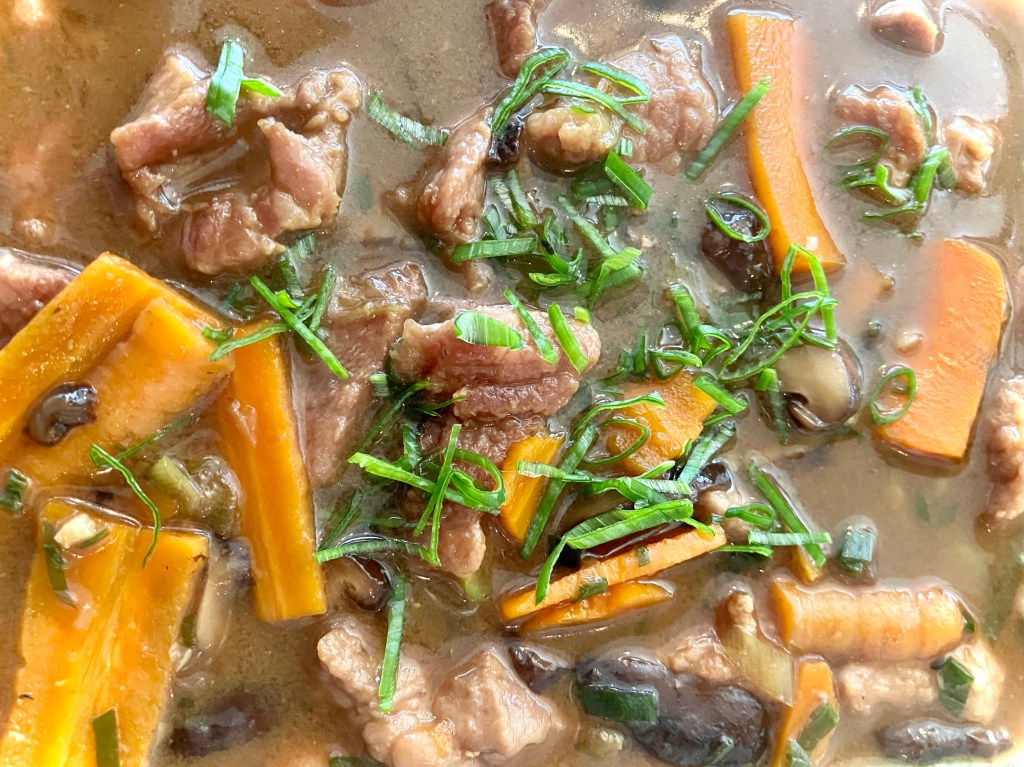- Ladle the contents onto a serving platter, top with minced scallion tops and sesame seeds